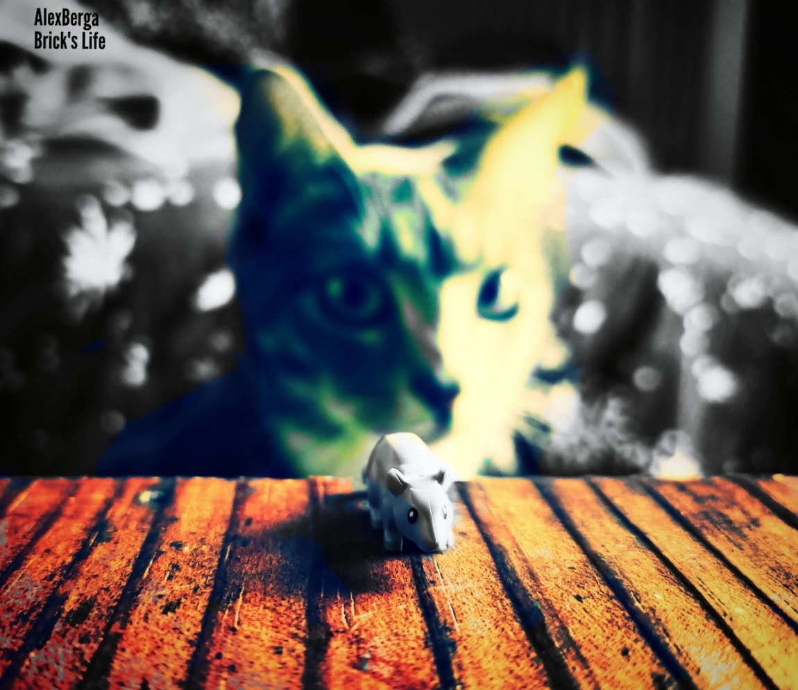 Ho realizzato questo scatto per un concorso che aveva il tema: I nostri Animali Lego! io avevo solo un topino.... Bè una foto di un topino Inseguito da un gatto poteva essere simpatica, ma per non renderla banale, invece di trovare un gatto Lego, ho chiesto aiuto a una collaboratrice d'eccezione: La mia miciona Eleanor!