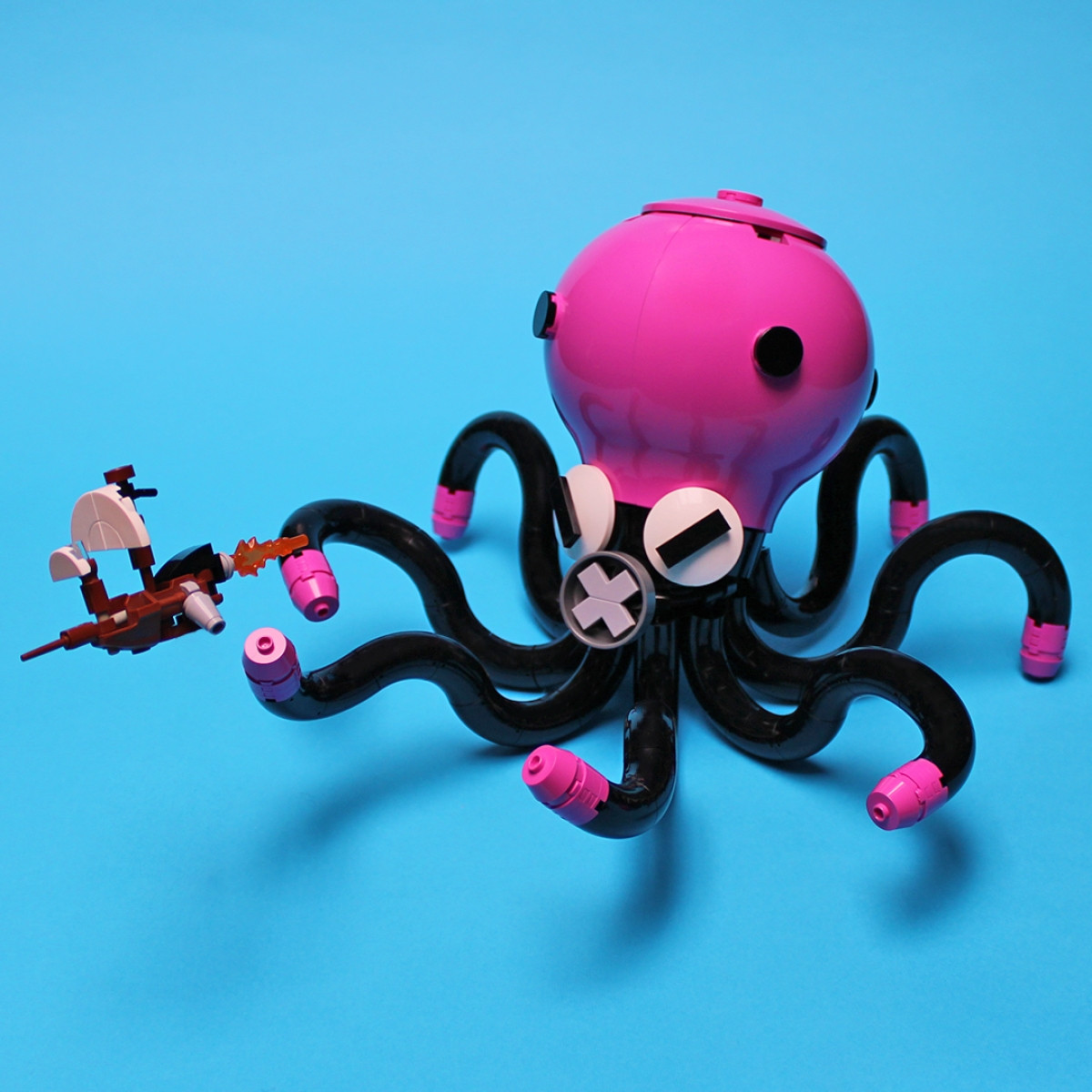 Un polpo cartoonesco realizzato a partire dai 4 grossi panel tondeggianti in dark pink, una volta uniti i 4 pezzi mi hanno ricordato la testa di un polpo e il resto è arrivato da se.