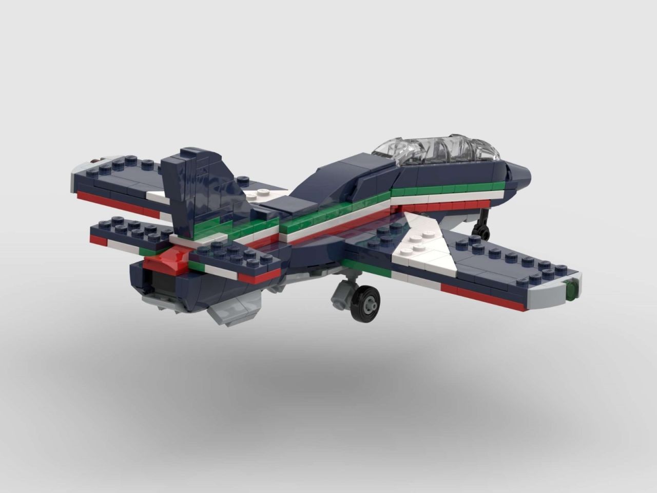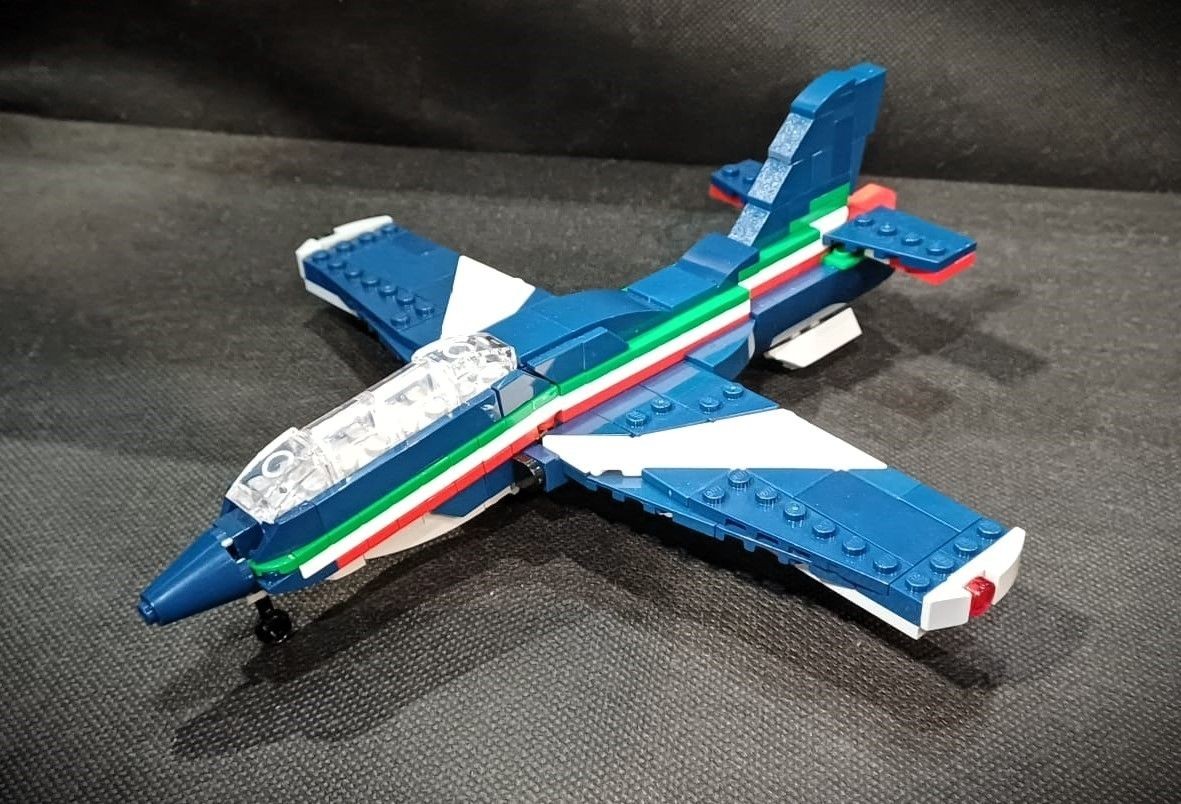 Moc di corredo al mio modello Frecce Tricolori Kinetic display. Raffigura l'Aermacchi MB-339, il modello di aereo che dal 1982 viene usato dalla pattuglia acrobatica nazionale per le sue esibizioni. È riprodotto in scala 1:45 e, come per il mio 747 Alitalia, mi sono fissato l'obiettivo di non usare nessun adesivo per realizzare la livrea. Lo ho progettato interamente su Studio e poi ne ho corretto i difetti e le imperfezioni mentre lo assemblavo dal vivo. Il tricolore che corre lungo le linee sinuose è aerodinamiche del corpo dell'aeroplano è chiaramente soggetto ad un certo grado di approssimazione dovendo usare solo mattoncini, ma trovo che il risultato finale sia sufficientemente ben fatto :)