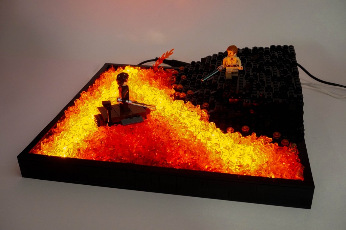 Il duello Anakin VS Obi-Wan Kenobi su Mustafar (da "Star Wars episodio III: La Vendetta dei Sith") è sicuramente una delle battaglie più spettacolari della saga di Star Wars così ho deciso di ricrearla in un modo molto particolare: se osservate con attenzione, ho realizzato la lava usando tanti cristalli LEGO (trans-orange crystals piece no. 11127) sotto ai quali ho posizionato due stecche di led a luce calda e una striscia led più piccola di luci rosse, in questo modo l'effetto ottenuto è realistico e stupefacente!