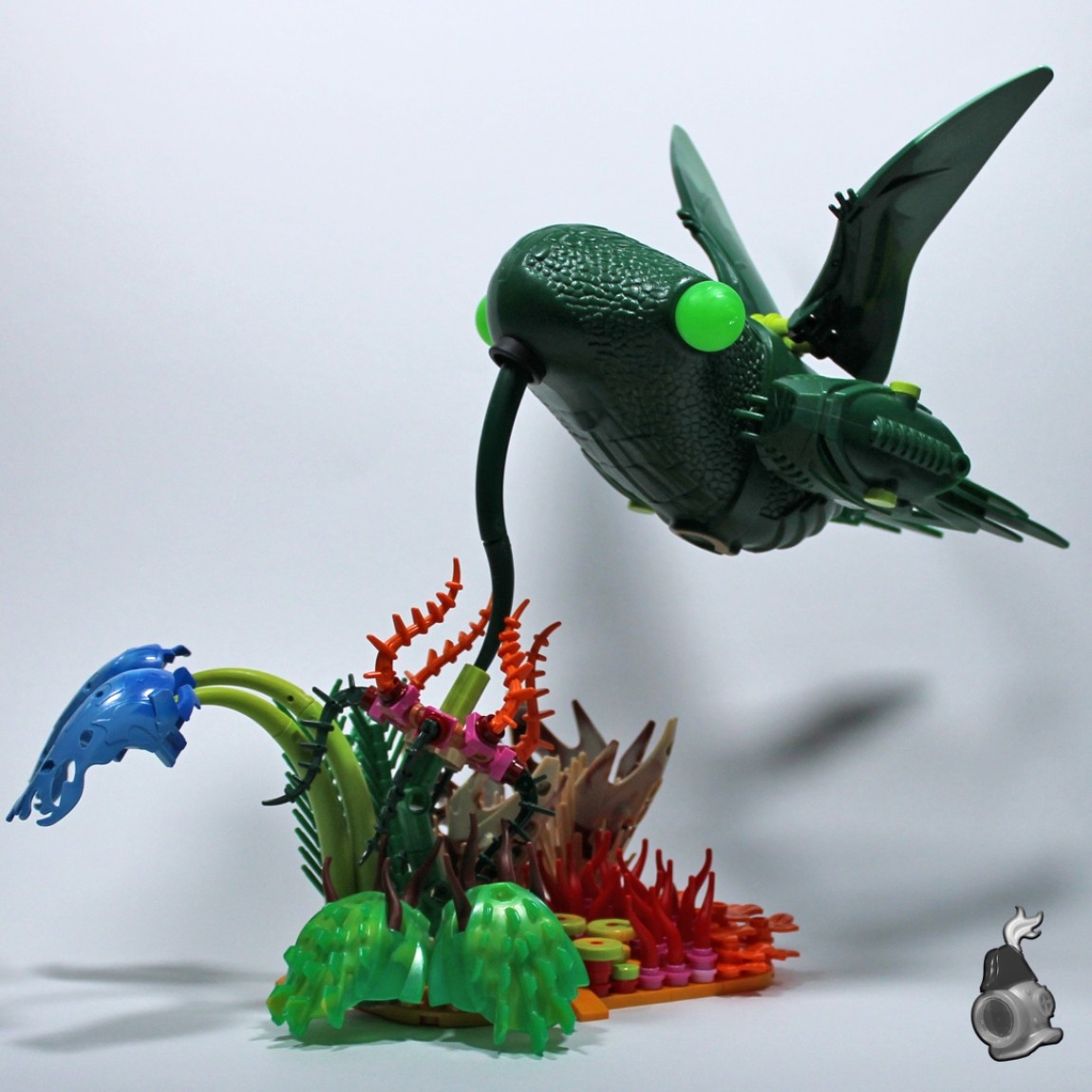 Moc nata a partire dal grosso pezzo verde scuro che compone il corpo della creatura, si tratta di un colibrì paffutto e sgraziato. Ho poi creato una base ricoperta di fiori e vegetazione usando pezzi di tutti i tipi come maschere Bionicle, corna, arbusti e dischi lancaibili della linea Exo-Force.