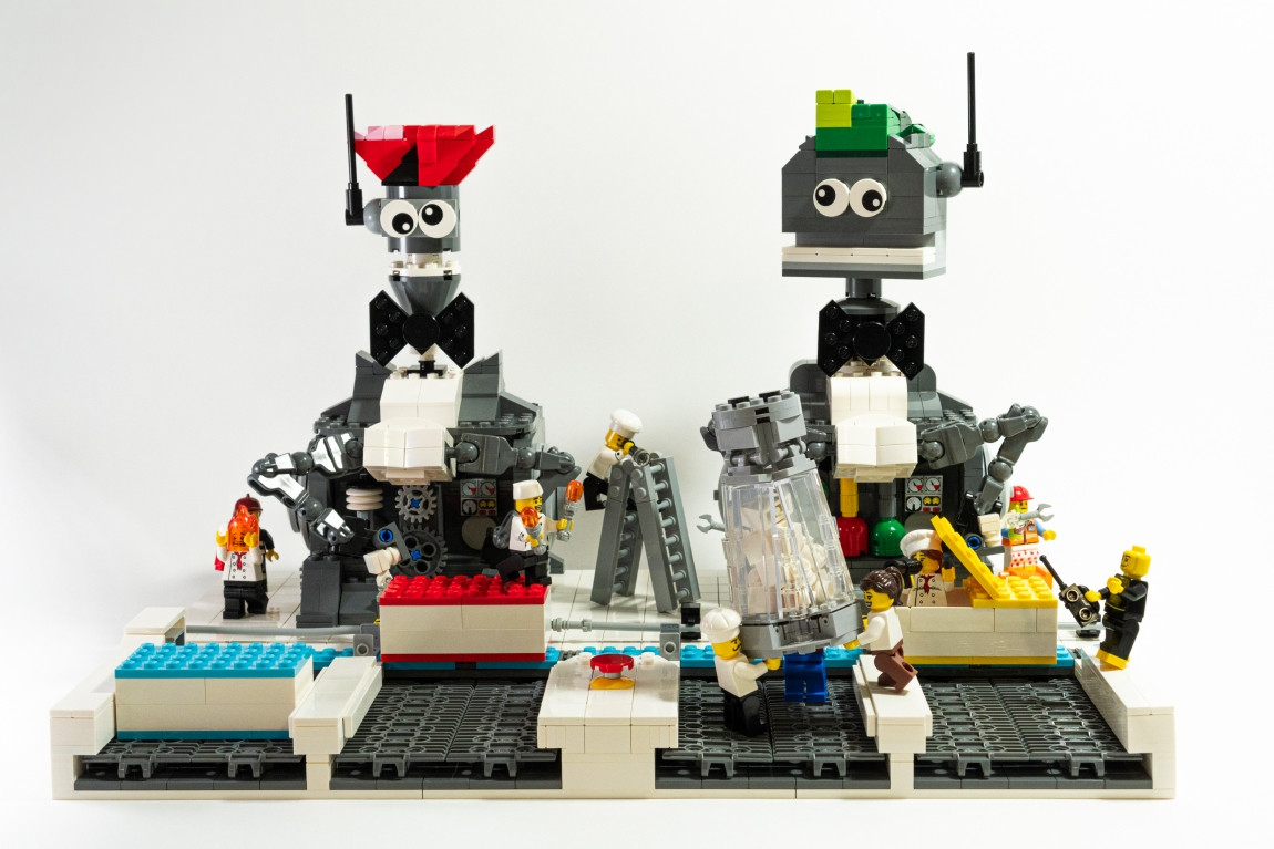 Nella mia MOC ho combinato insieme i video delle minifigures e la riproduzione reale del bancone con i robot, creando una piccola scenetta in cui lo chef chiede di portare il sale al box giallo. Ho aggiunto anche altri piccoli dettagli come l'uomo con le scarpe gialle che in realtà è Stuart Harris, il Senior LEGO Designer della LEGO House.