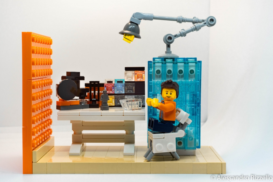 Come da titolo, questa è la mia LEGO room! In particolare, questa è la riproduzione esatta di un angolo della mia mansarda col tavolo dove costruisco tutte le mie creazioni. La mia minifig è sulla sedia a destra, dietro c'è una vetrina blu con una lampada da studio mentre sul tavolo (rigorosamente Ikea) ci sono tanti cassettini con pezzi suddivisi per categoria e colore. Sul lato sinistro del tavolo potete notare un piccolo easter egg, ovvero la riproduzione in microscala del logo OrangeTeam LUG che avevo realizzato in versione tensegrity poche settimane fa (e che potete vedere qui). Infine a sinistra, c'è una parte del muro arancione della mia mansarda e sì... Ho una parete arancione e l'ho fatta verniciare dell'esatta tonalità di arancione dei pezzi LEGO.