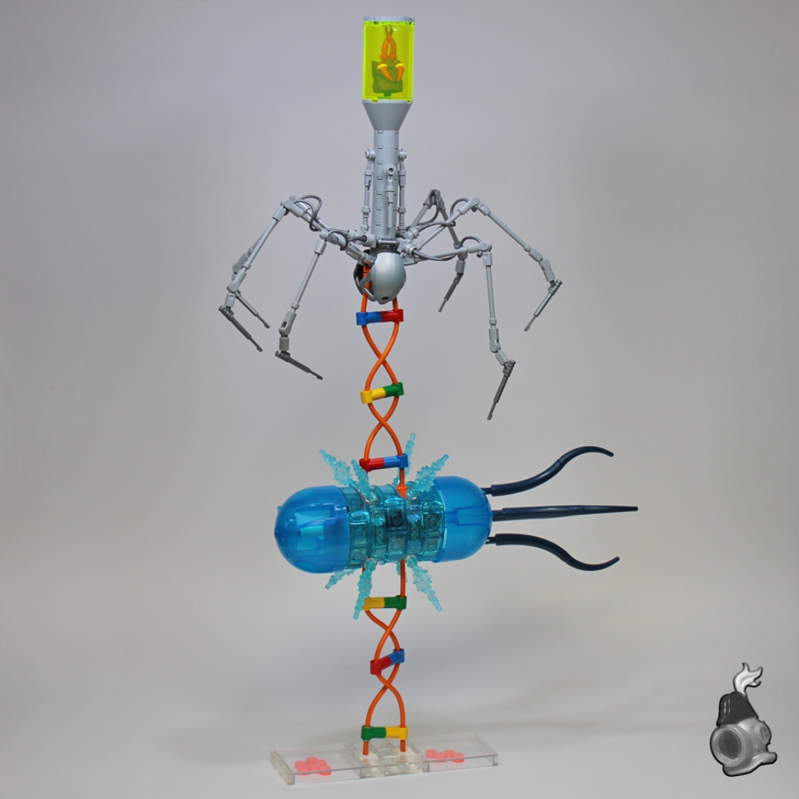 Riproduzione di un batteriofoga in versione moc. Siccome questo particolare tipo di Virus mi ha sempre ricordato un piccolo robot ho deciso di riprodurlo come se fosse effettivamente un robot, al posto di iniettare il proprio DNA all'interno dei batteri questa verione robotica spara un raggio laser a forma di doppia elica.