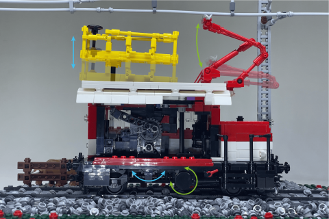 This MOC has two functions to make it playable: the pantograph can be raised and lowered through the elastic with the control placed under the right side, while the bridge tower can be raised and lowered through the gear placed under the frame and then rotated manually. The two functions and their mechanism are visible in the 9th photo.