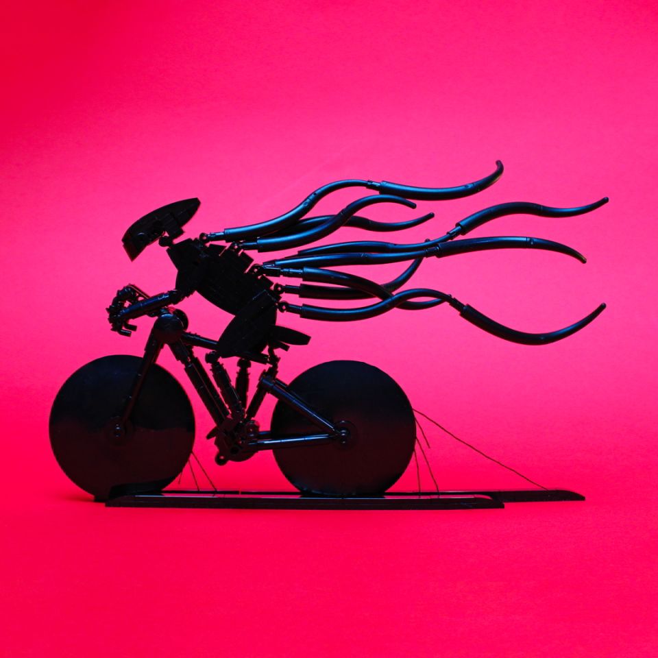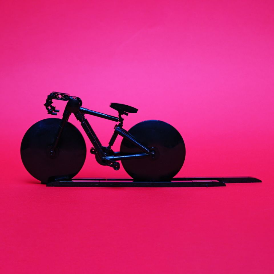 Una bici da corsa con ruote piene e il suo ciclista che sfrecciano verso il traguardo