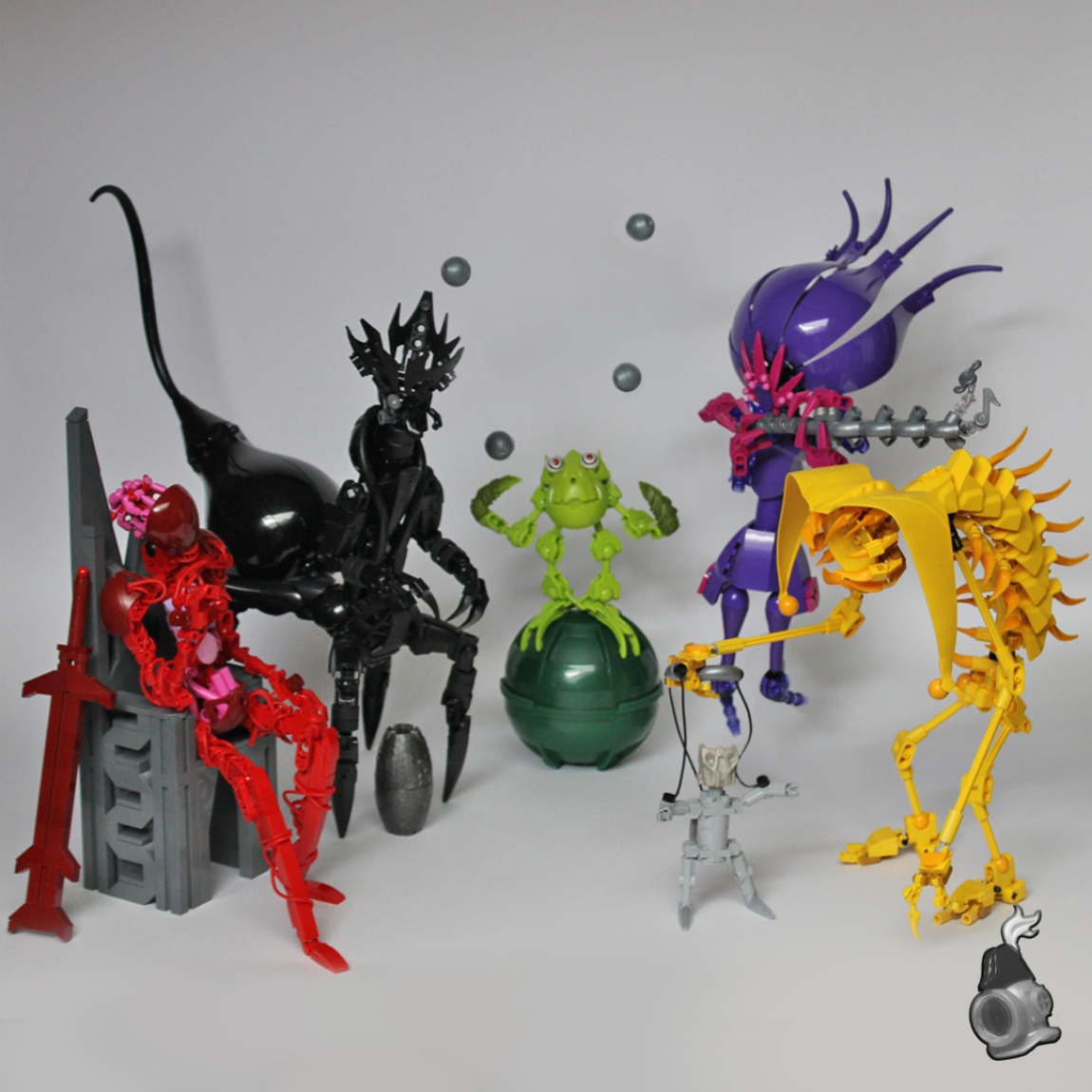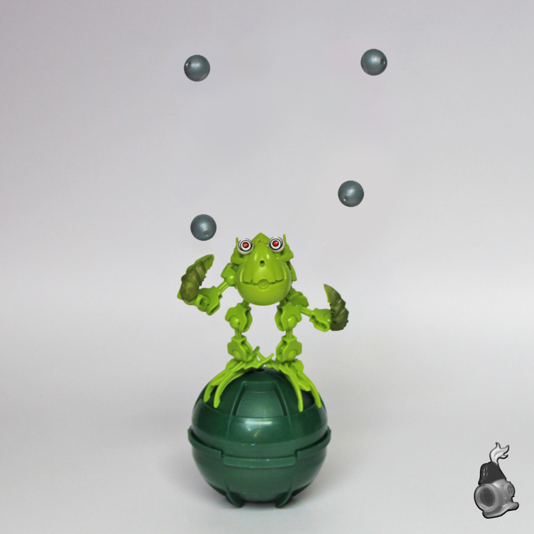 Per il Giocoliere invece volevo creare qualcosa di piccolino e buffo, volevo che fosse completamente lime e manipolando la maschera di questo personaggio Hero Factory (https://www.bricklink.com/v2/catalog/catalogitem.page?S=6201-1&name=Toxic%20Reapa&category=%5BHero%20Factory%5D%5BVillains%5D#T=S&O={%22iconly%22:0}) mi sono aaccorto che il foro presente sopra alla testa poteva diventare in qualche modo una bocca aggiungendo un paio di occhi sopra alle "antenne" presenti sul volto di questa maschera. La sfera in dark green presente sotto ai suoi piedi è realizzata unendo due coperchi dei canister di alcuni set bionicle.