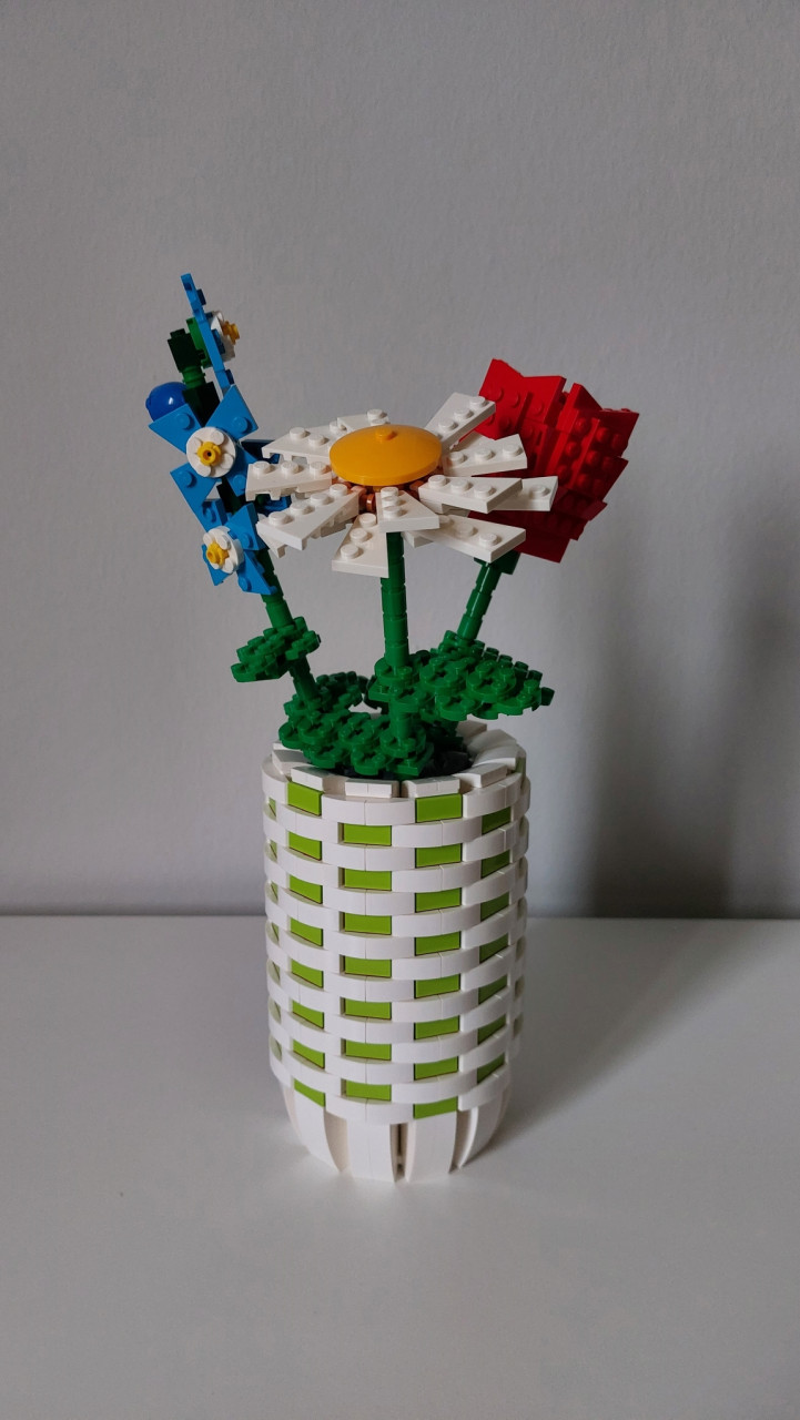 Riproduzione di un vaso con fiori recisi. Troviamo un Tulipano, una Margherita e un Non ti scordar di me.