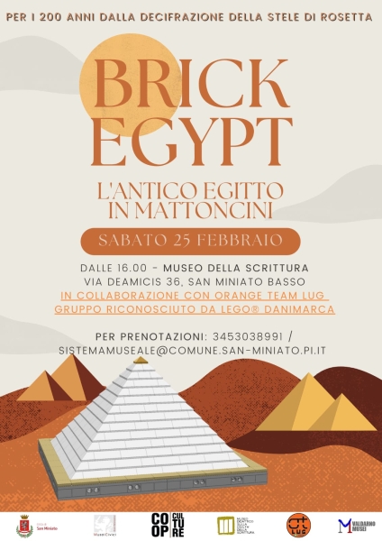 Laboratorio sul papiro e sui geroglifici con un vero egittologo, laboratorio coi mattoncini LEGO® ed esposizione di opere in mattoncini a tema.