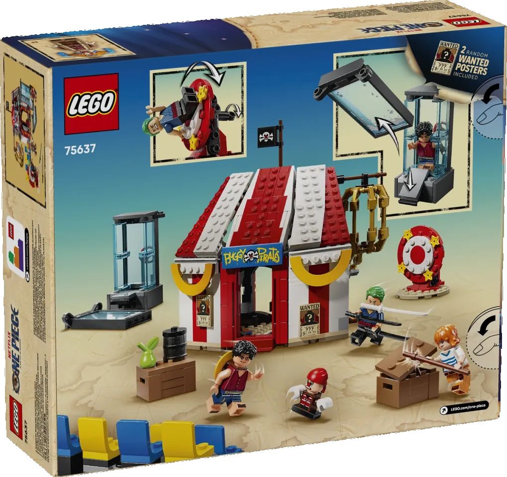 Il covo del subdolo clown cattivo comprende tre marchingegni da cui gli eroi devono fuggire: una vasca d'acqua, un tavolo verticale girevole e una gabbia sospesa ed è personalizzabile con due poster "Wanted", in modo che i giovani fan possano creare il proprio mondo ONE PIECE. Il set comprende le Minifigure di Bagy il Clown, Monkey D. Luffy, Nami e Zoro.