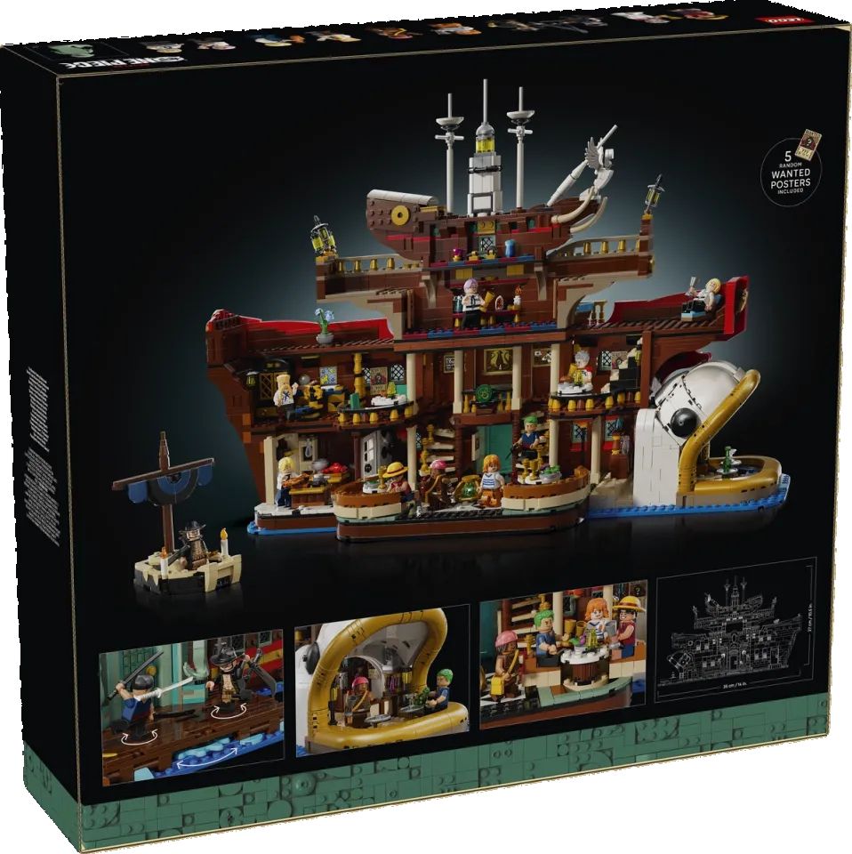 Questo accattivante set è composto da oltre 1.376 pezzi, che danno vita al dettagliato ponte e agli interni della nave, con una grande vela stampata con l'iconico teschio Jolly Roger, per guidare la ciurma verso acque inesplorate, mentre si imbarca alla ricerca del famoso tesoro di One Piece. Questo set include quattro poster "Wanted" da collezione.
