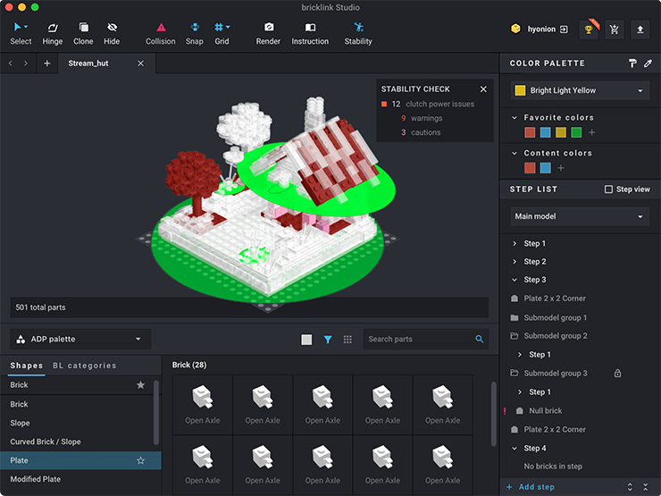 Sarà inclusa una nuova palette di colori per edifici, specificatamene ideata per l’ AFOL Designer Program, al fine di permetterti di concentrarti sul disegno stesso. Successivamente, verifica se il tuo design è stabile con il nuovissimo controllo di stabilità, perché vogliamo innamorarci dei progetti, senza farli cadere a pezzi. Quindi puoi esportare immagini mozzafiato e persino creare istruzioni di costruzione per i tuoi progetti!