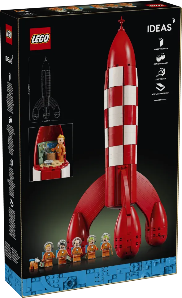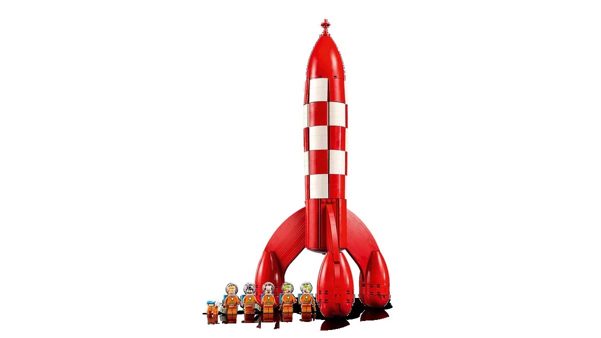 Il set include sei personaggi classici di Tintin: Tintin, il Capitano Haddock, il Professor Calculus, Thomson e Thompson, tutti vestiti con tute spaziali dettagliate con caschi e bombole di ossigeno, oltre a una minifigure del cane Milù. I costruttori possono rivivere un momento iconico di "Uomini sulla Luna" rimuovendo un pannello nella parte superiore del razzo per rivelare una sala di controllo nascosta, consentendo di posizionare una minifigure all'interno per la prima vista mozzafiato della Terra dallo spazio.