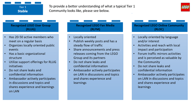 Le Comunità Online riconosciute sono presenti principalmente online e fanno la maggior parte delle loro attività attraverso il loro forum online in cui guidano discussioni, recensioni di prodotti, concorsi e tutto ciò che celebra il marchio LEGO.