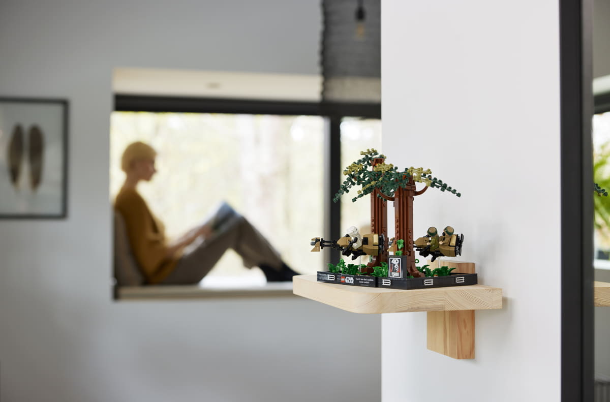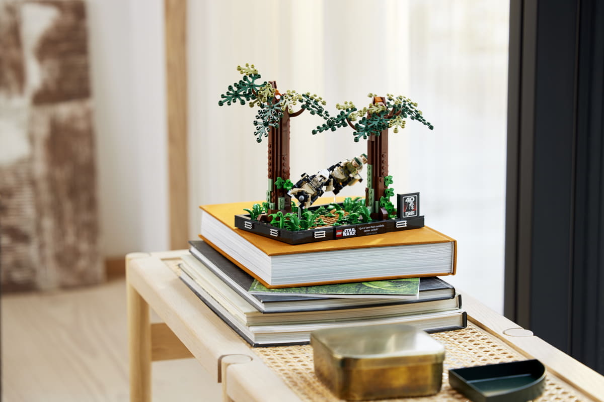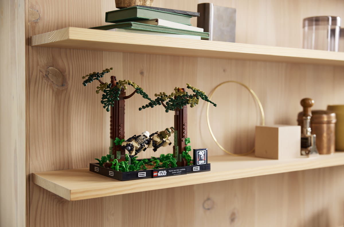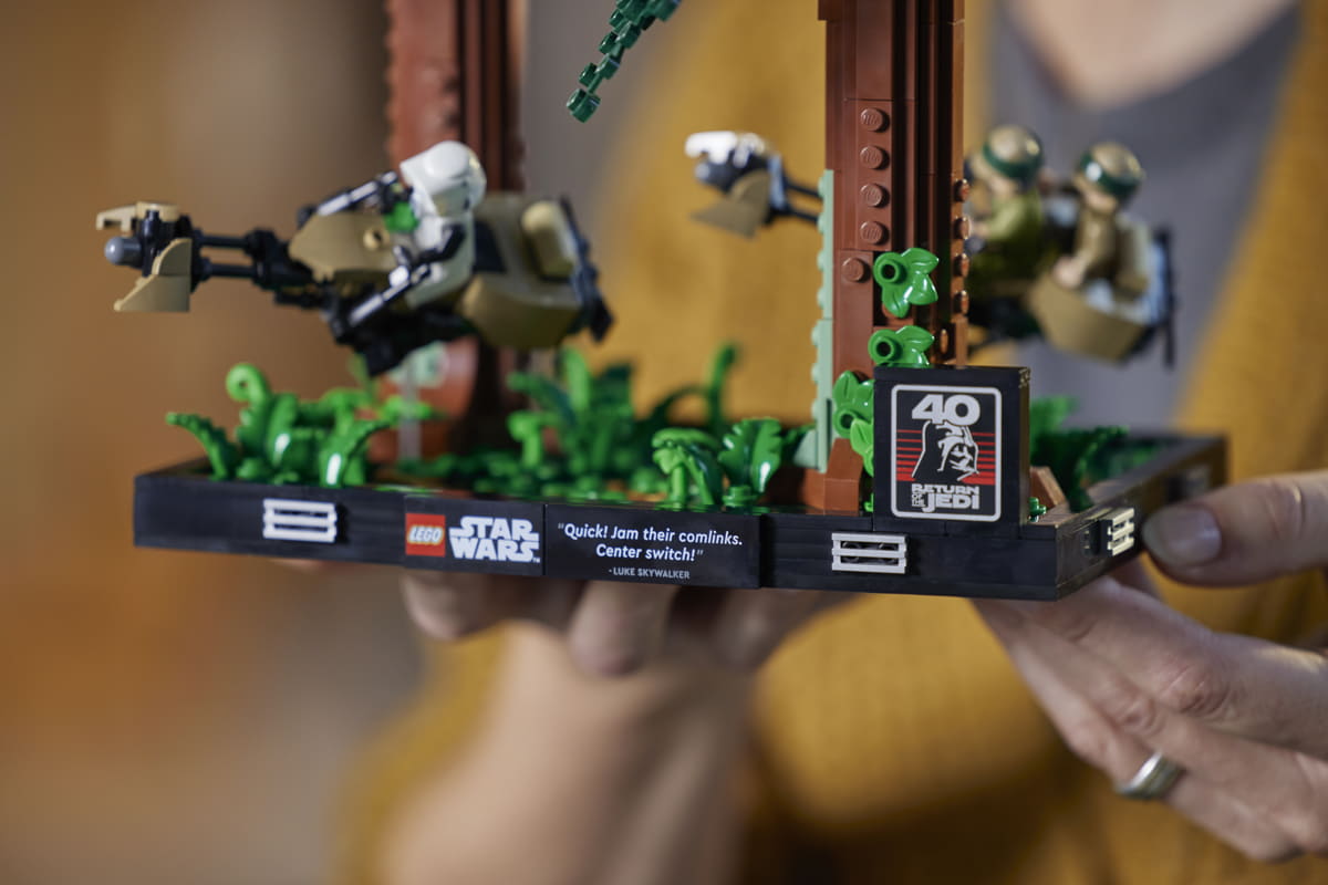 Per i fan in viaggio verso Endor, il diorama Endor Speeder Chase da 608 pezzi dà vita all'azione ad alta velocità tra il lussureggiante suolo della foresta, con Luke Skywalker™ che corre su una speeder bike tra gli alberi.