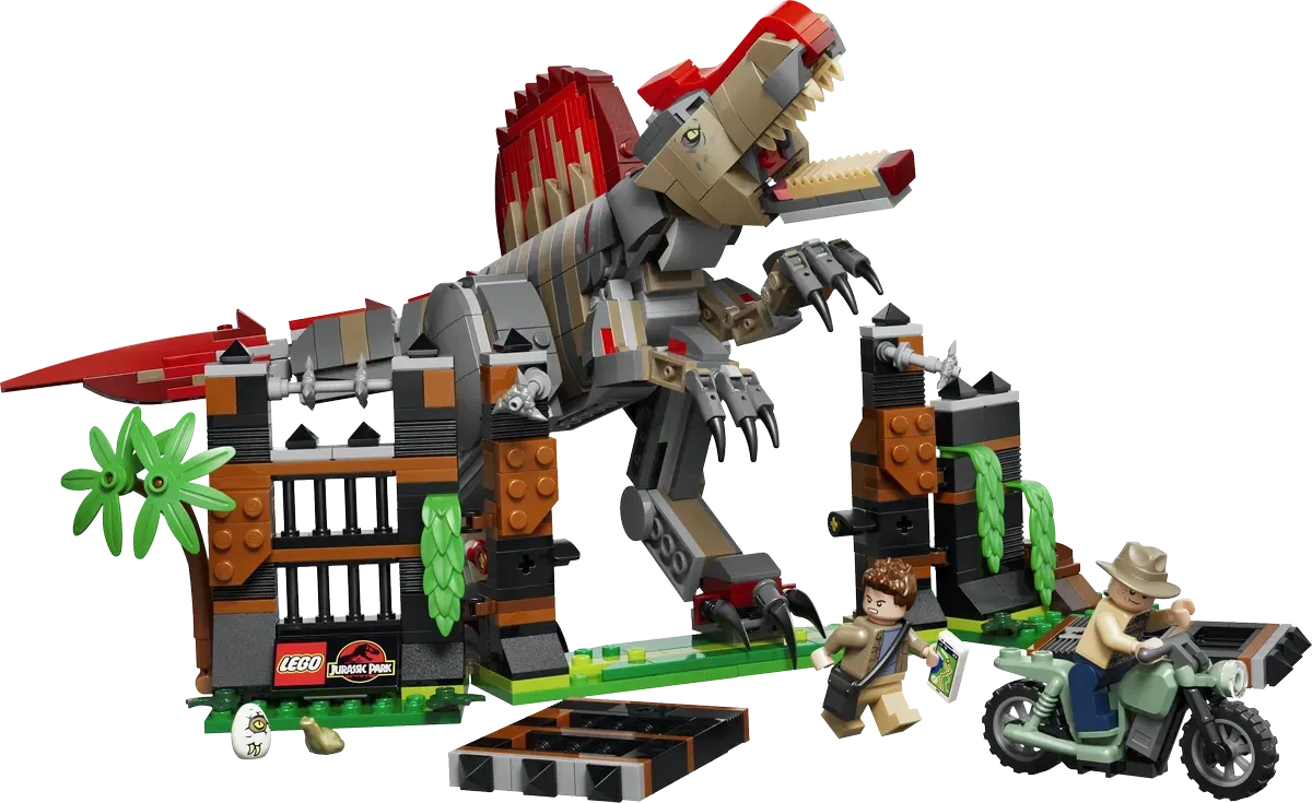 Questo set permette di ricreare l'iconica scena di Jurassic Park III pianificando la fuga dallo Spinosauro costruibile in mattoncini LEGO.