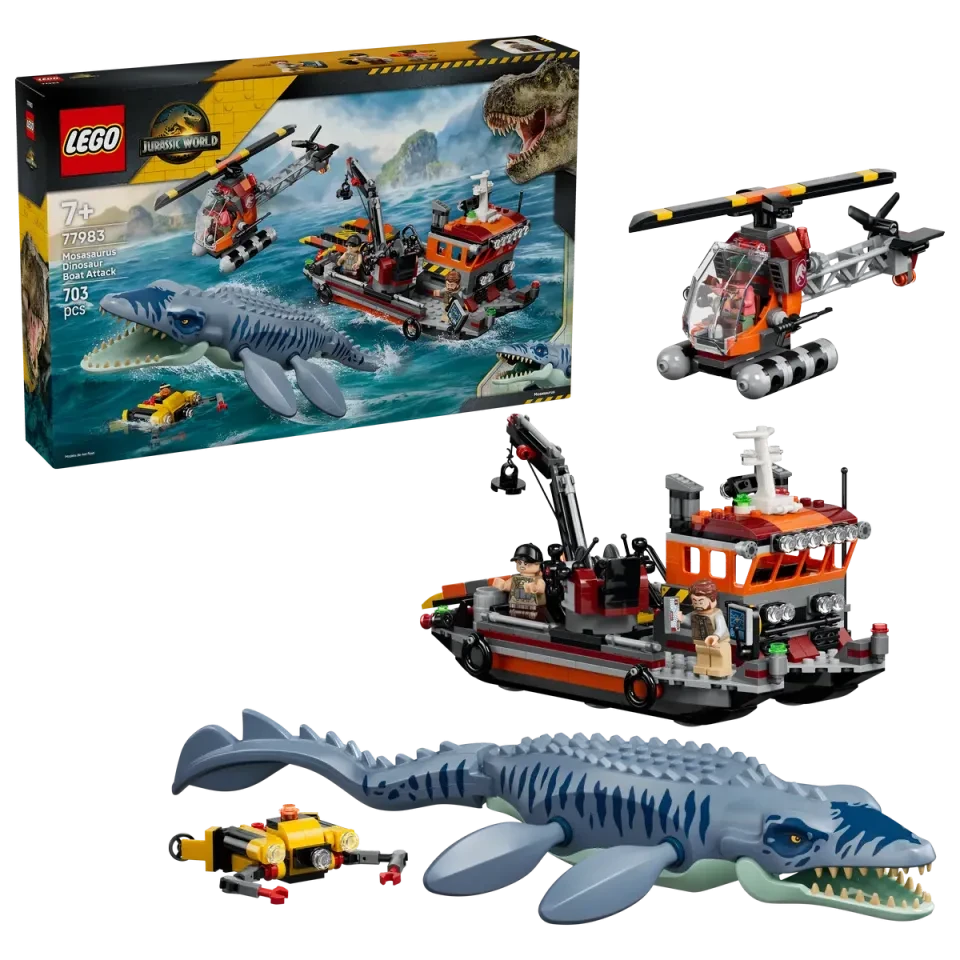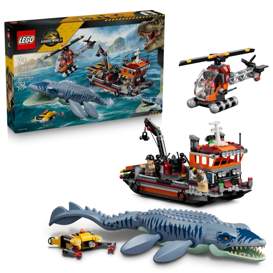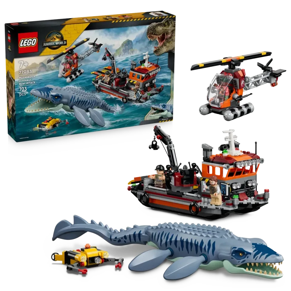 Grazie a questo set, i fan potranno salpare per un'avventura in mare con barca, elicottero, drone subacqueo e arpione alla ricerca del Mosasauro.