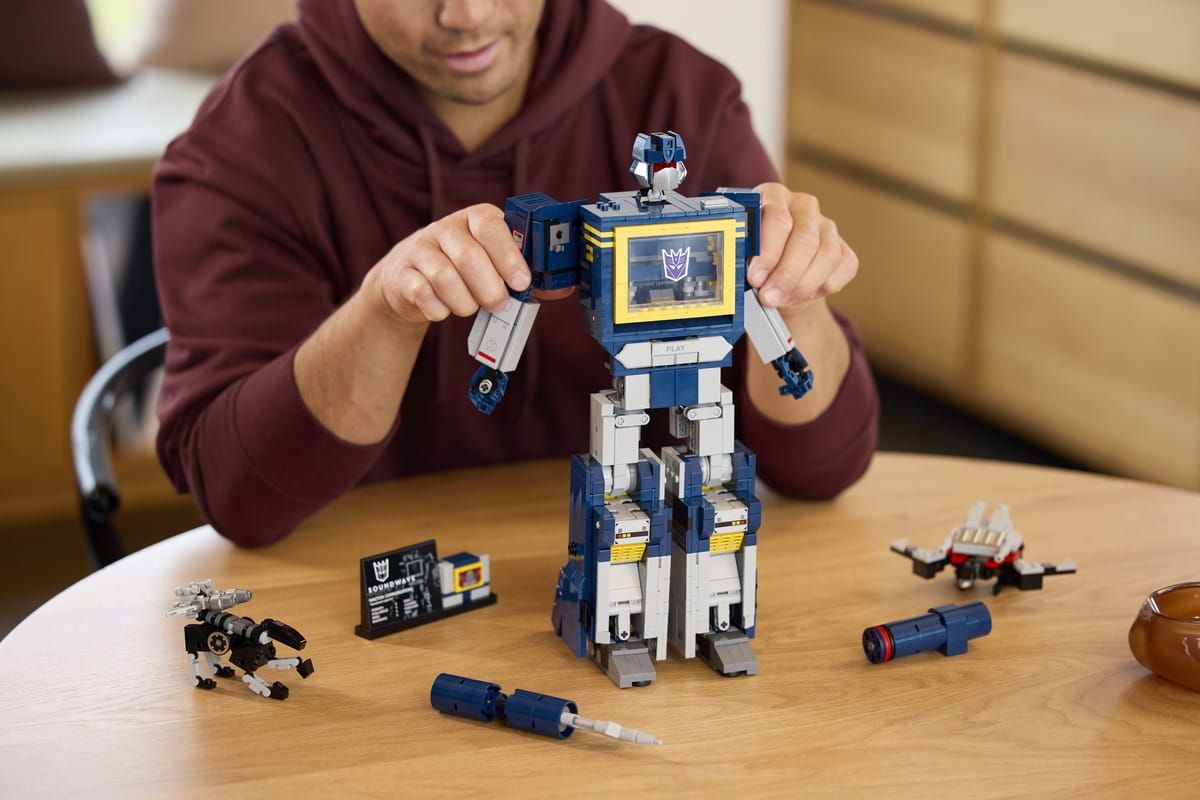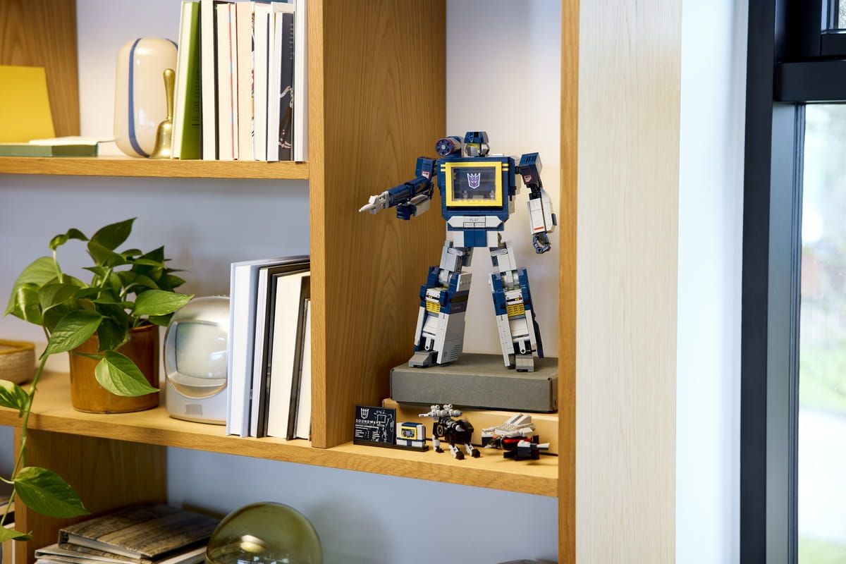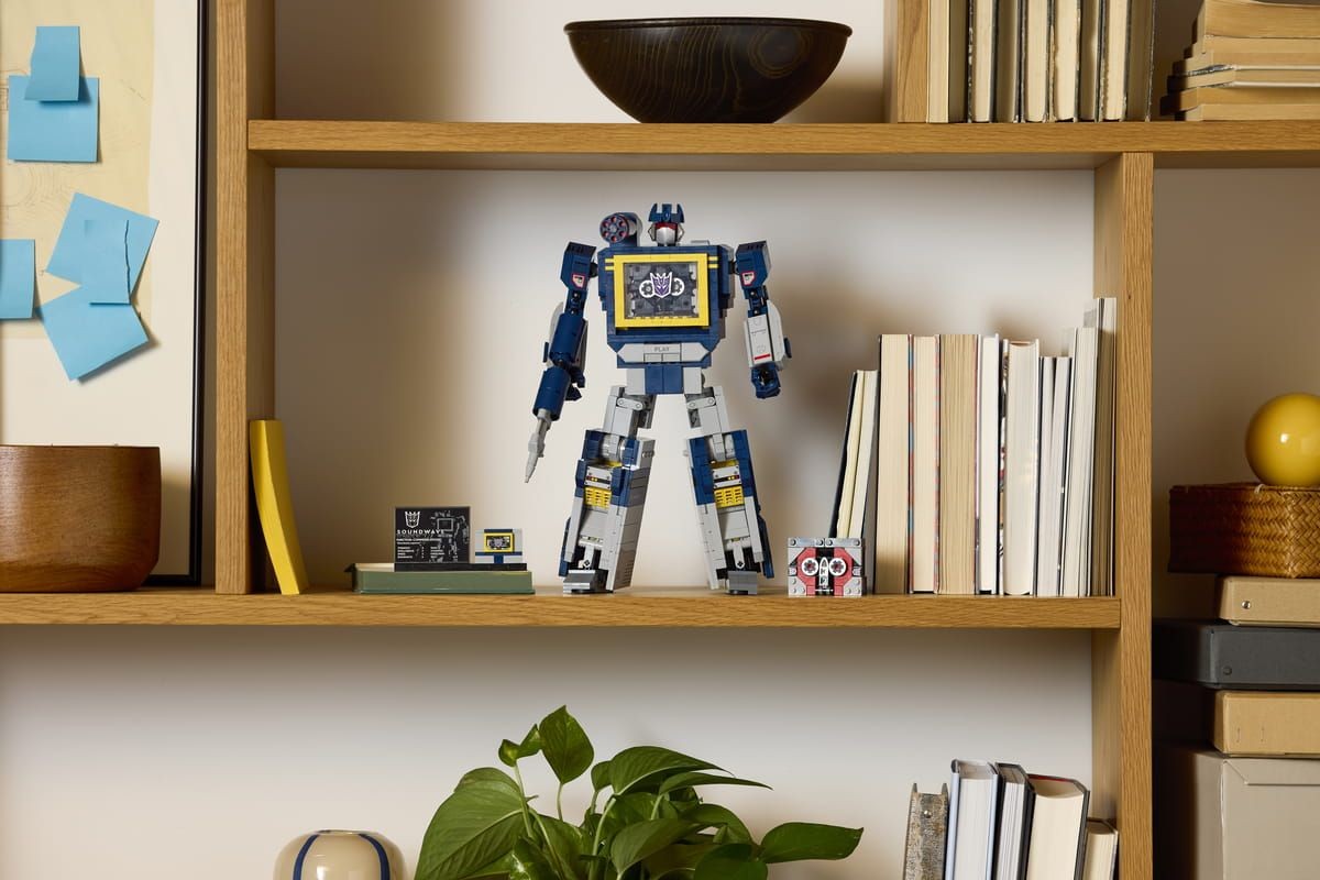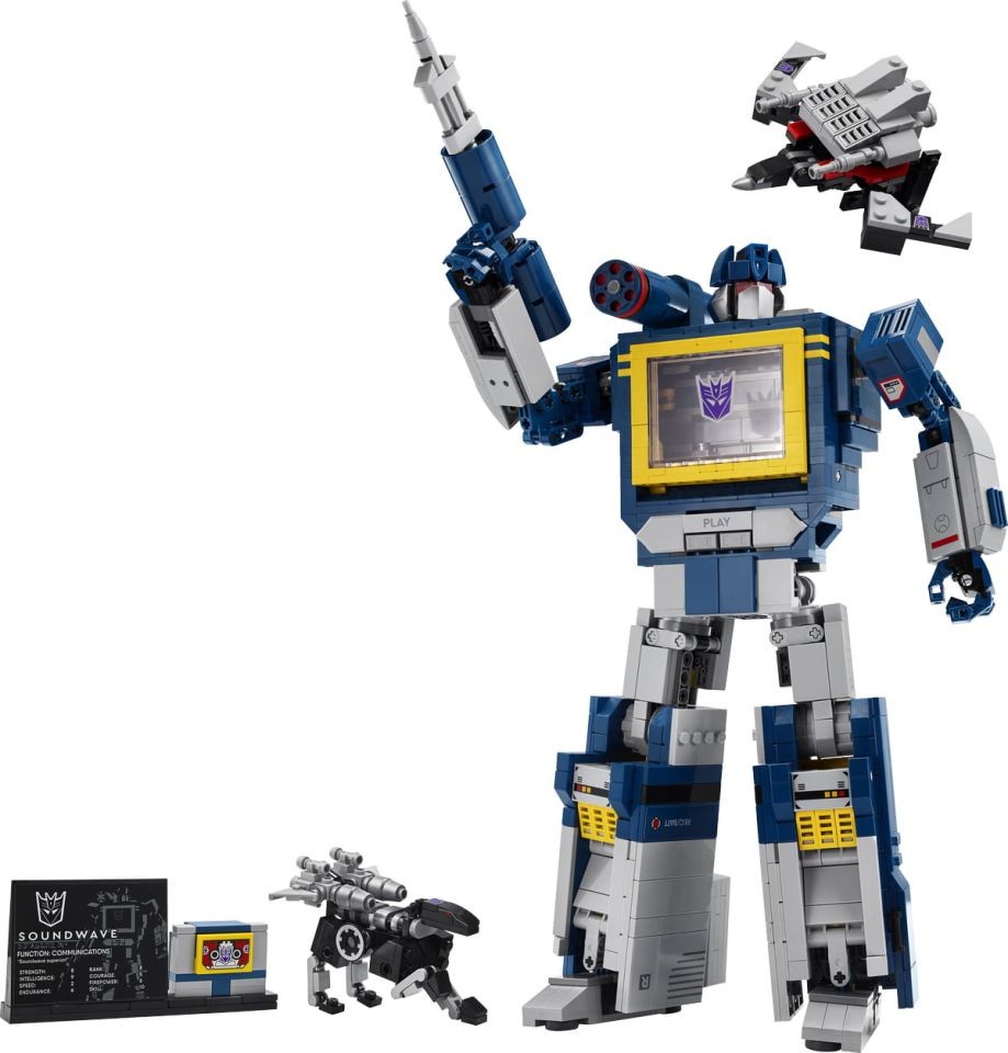 Ad accompagnare Soundwave ci sono due compagni cassette costruibili: Ravage e Laserbeak, che si trasformano in cassette miniaturizzate e si inseriscono perfettamente nello scomparto sul petto di Soundwave. Gli accessori, tra cui un razzo, un blaster laser e freccette, aggiungono autenticità e azione al set. Una targa espositiva che mostra le statistiche di potenza di Soundwave lo rende un perfetto centrotavola per la casa o l'ufficio. Questo nuovo set aggiunge un malvagio Decepticon alla linea LEGO Icons TRANSFORMERS esistente, che comprende anche il set LEGO Icons Optimus Prime e il set LEGO Icons Bumblebee.