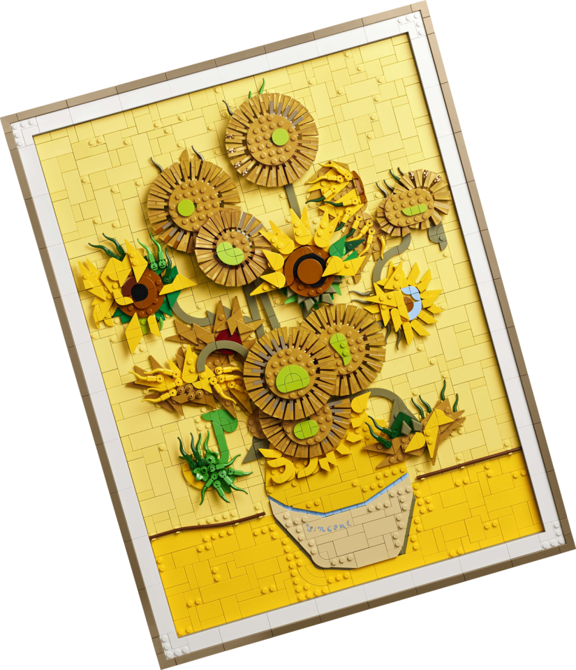 Con i suoi 2.615 pezzi, il set permette ai fan di entrare nella mente di uno dei pittori più amati al mondo e di conoscere i segreti di uno dei suoi maggiori capolavori: I girasoli, dipinto da Van Gogh nel 1889 durante il suo soggiorno ad Arles, in Francia. La novità, infatti, è una versione 3d, ovviamente in mattoncini, in cui spiccano le tre radiose tonalità di giallo, il famoso uso di luci e ombre di Van Gogh e le sue iconiche pennellate. Il set è composto da 16 girasoli, con petali regolabili, da una cornice removibile, un mini quadro con la firma del geniale artista e un gancio per appendere il prodotto montato.