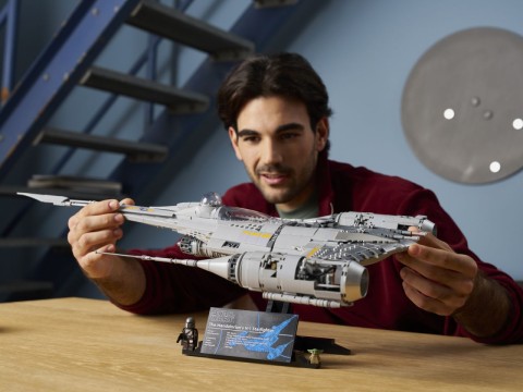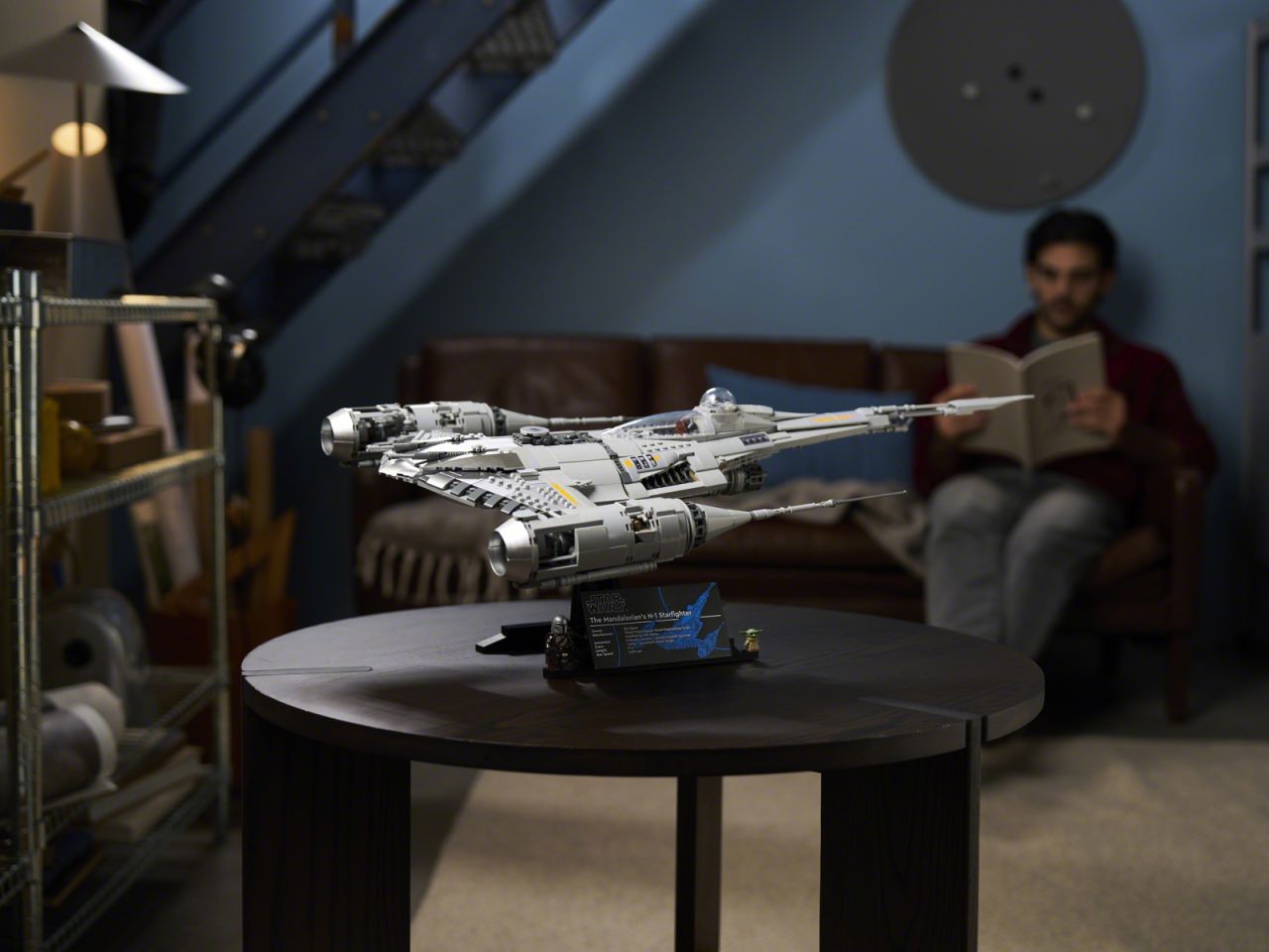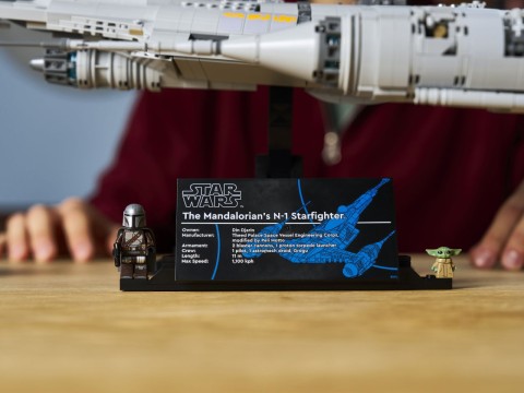 Il set include una minifigure LEGO Star Wars del Mandaloriano™, dotata di pistola blaster, e una figura di Grogu™ da posizionare accanto al modello finito. Una volta completato, i fan possono esporre il caccia sul supporto con targhetta informativa, scegliendo tra due modalità dinamiche: di profilo, per evidenziare l'eleganza, oppure frontale, per un aspetto pronto all'azione.