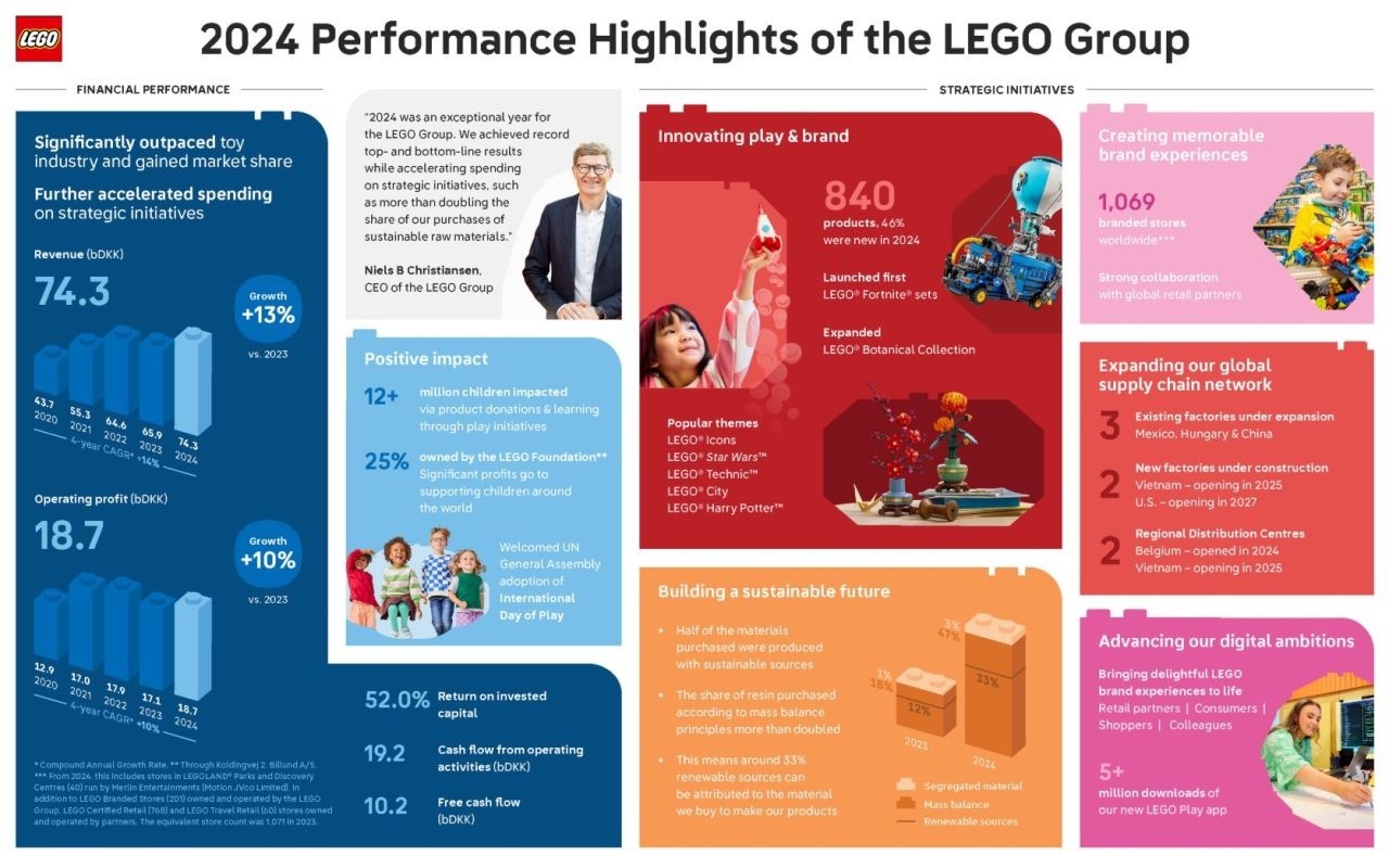 BILLUND, DANIMARCA, 11 marzo 2025: Il LEGO Group ha pubblicato oggi i suoi risultati annuali per il 2024. L'azienda ha raggiunto ricavi e profitti operativi record, superando il mercato dei giocattoli con significativi guadagni di quote di mercato. La crescita dei ricavi a due cifre è stata guidata dalla forte domanda per il suo ampio e diversificato portafoglio, dall'eccellente esecuzione nei mercati e da una supply chain resiliente. Per supportare la crescita ora e in futuro, l'azienda ha accelerato la spesa per iniziative strategiche.