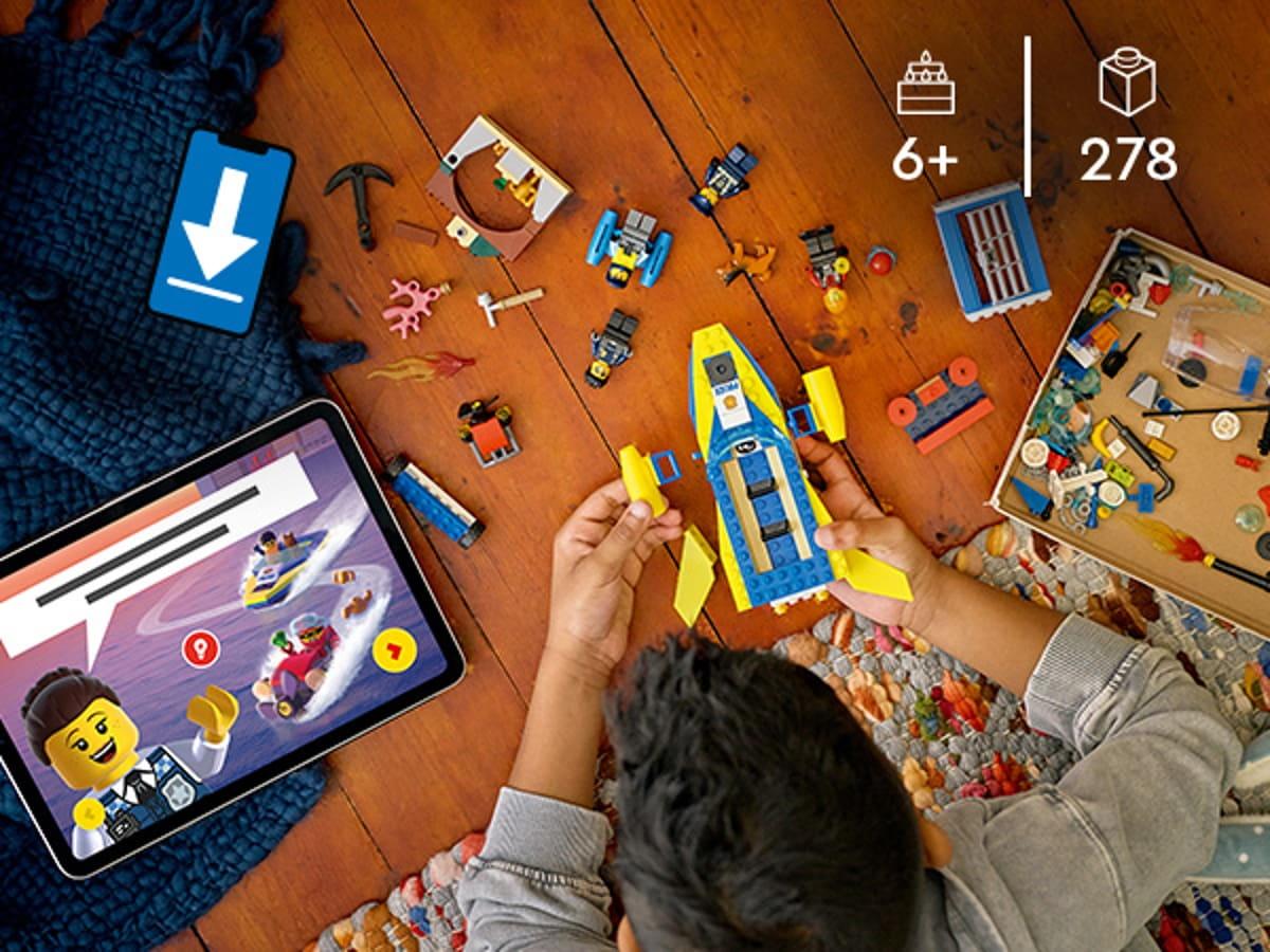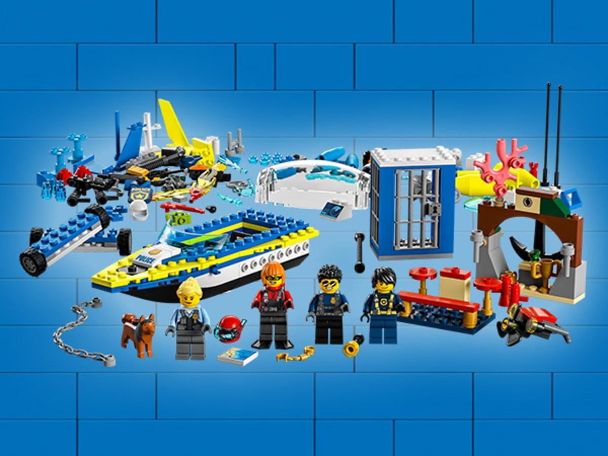- LEGO® City Missioni investigative della polizia marittima dà ai bambini l'opportunità di unirsi alla squadra di polizia LEGO City e risolvere il mistero dell'oceano. I bambini posso customizzare la barca con tanti accessori: una macchina fotografica, un trofeo, una maschera da palombaro, manette, walkie-talkie e altro ancora per giocare al detective e lavorare al fianco dei personaggi preferiti come il Capo Wheeler e Gracie Goodhart. Nel set, anche un simpatico amico peloso per aiutare nella missione!