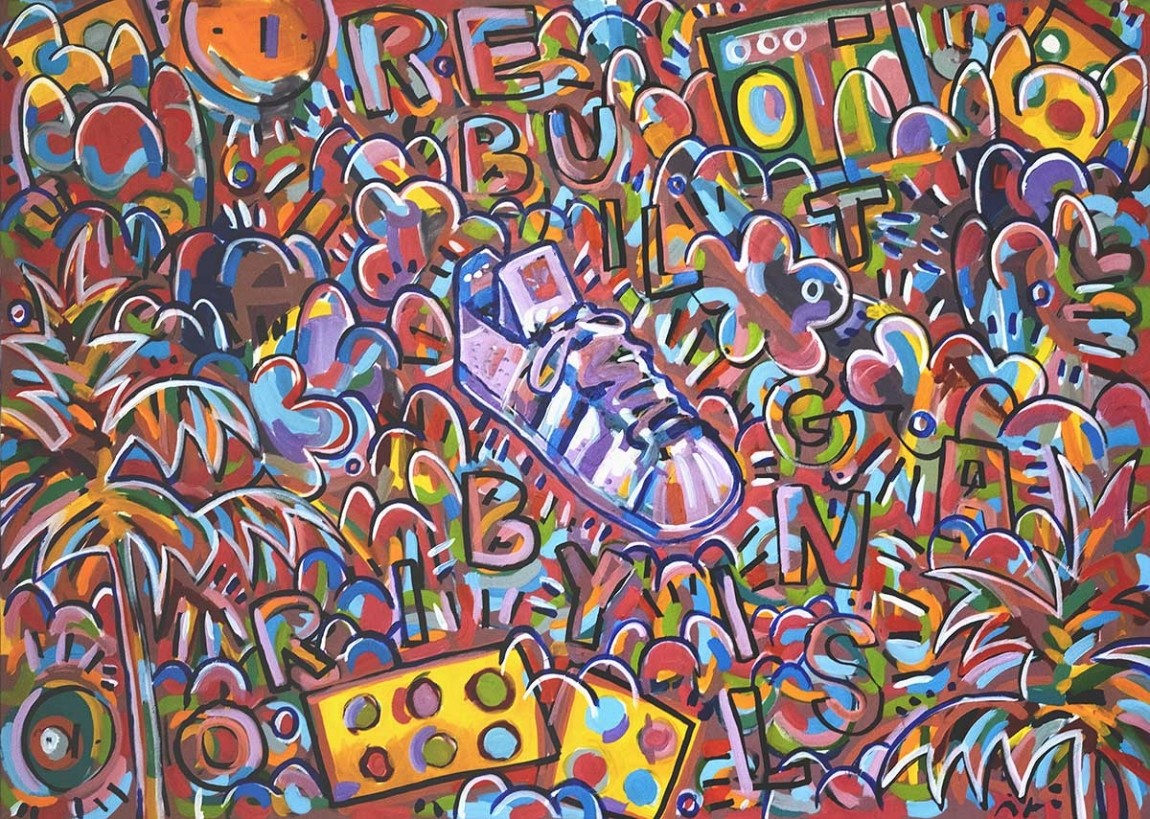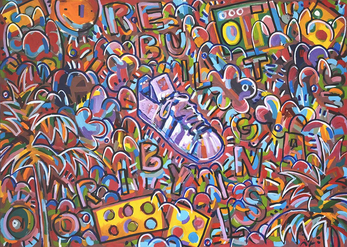 “Giocattoli anni 80 e sneakers vintage compaiono nelle mie creazioni da sempre, perché la mia ricerca artistica si nutre di reminiscenze d’ infanzia, persistenza della memoria, processi identitari, decostruzioni” dice Percy B, l’artista dalla spinta creativa deflagrante che investe ogni mezzo con cui si confronta, dall’arte al fumetto.