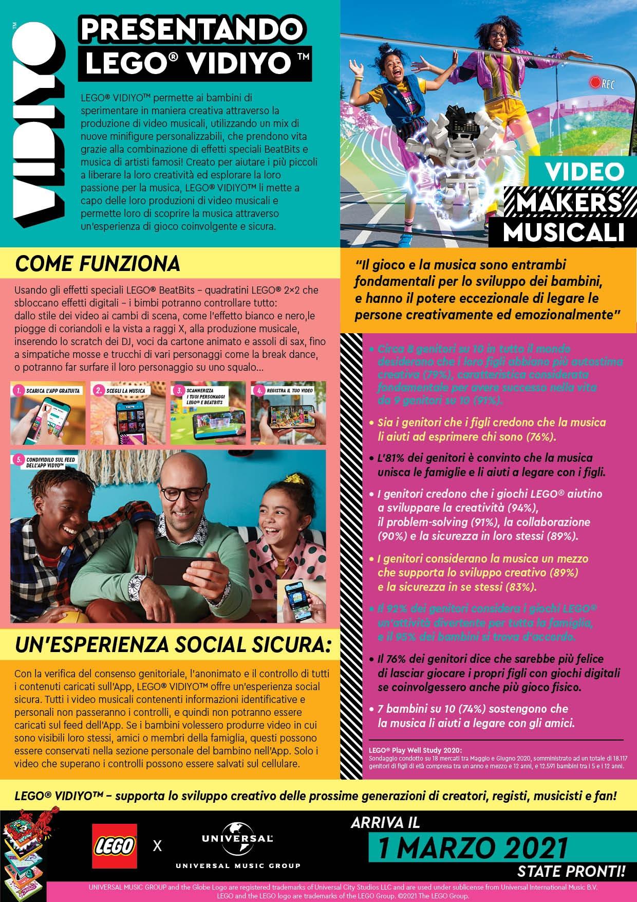 Combinando le nuove tecnologie con LEGO System in Play e musica di generi diversissimi, degli artisti più in voga del momento, LEGO® VIDIYO™ fornisce ai bambini una nuova opportunità di esprimersi in maniera creativa, incaricandoli delle proprie produzioni musicali. In questo modo potranno ritrovare la loro musica preferita attraverso l’immersione in un’esperienza positiva e sicura: infatti, LEGO® VIDIYO™ richiede oltre al consenso genitoriale (e garantendo l’anonimato) anche un controllo sui contenuti caricati sul feed dell’App. I genitori non si preoccupino: il loro bambino sta esprimendo la sua creatività online in modo sicuro!