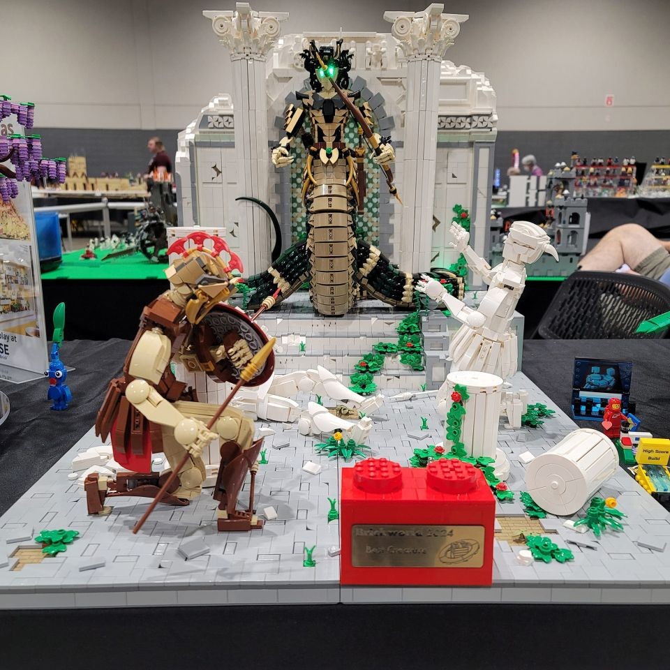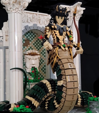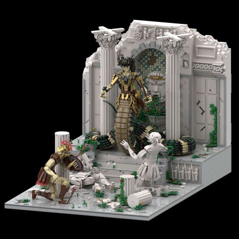 My most ambitious creation to date is Medusa's Lair. I refer to it as the MOC that got out of hand.It started simply enough as a rendering of Medusa but exploded to a full diorama with multiple characters and a temple backdrop. At over 14500 parts, it is by far my largest model