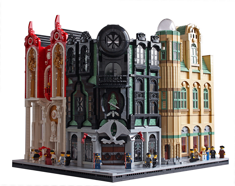 My largest model is Tampereen Pankki (Tampere bank) which is an amalgam of two Art Nouveau bank buildings I'm investigating in my current thesis. The model is a cross section with relatively realistic proportions, structures, materials and spaces, which means the construction is quite dense. The model measures 64x96 studs, aka 6 modules - although I never use baseplates as they're slippery and bendy