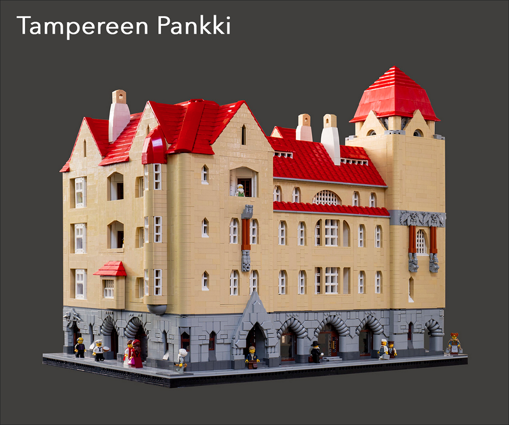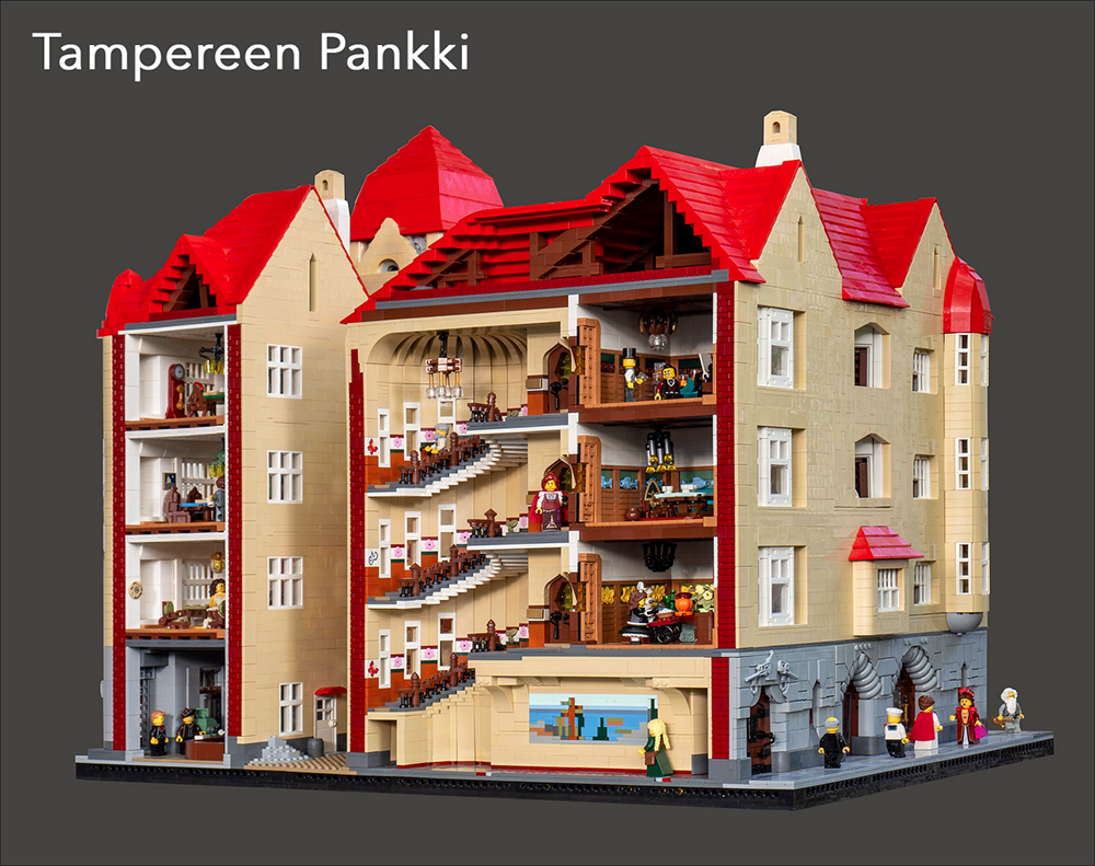 Il mio modello più grande è la Tampereen Pankki (banca di Tampere), un amalgama di due edifici bancari in stile Art Nouveau che sto studiando nella mia attuale tesi. Il modello è una sezione trasversale con proporzioni, strutture, materiali e spazi relativamente realistici, il che significa che la costruzione è piuttosto densa. Il modello misura 64x96 stud, ovvero 6 moduli, anche se non uso mai basi perché sono scivolose e flessibili