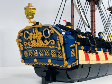 La fregata corsara Fortuna, ricostruita per la mia partecipazione al BDP6 (attualmente selezionata). Perché? Rispetto alle mie precedenti partecipazioni al BDP, Fortuna presenta ora una silhouette inclinata più dolcemente verso prua e poppa, decorazioni di poppa e di prua più armoniose e una maggiore stabilità. Il meccanismo dell'argano ora funziona in modo più fluido, integrando anche caratteristiche delle mie precedenti creazioni: uno scafo inclinato in mattoncini con cerniere, cannoni a scomparsa individuali e un interno completamente accessibile