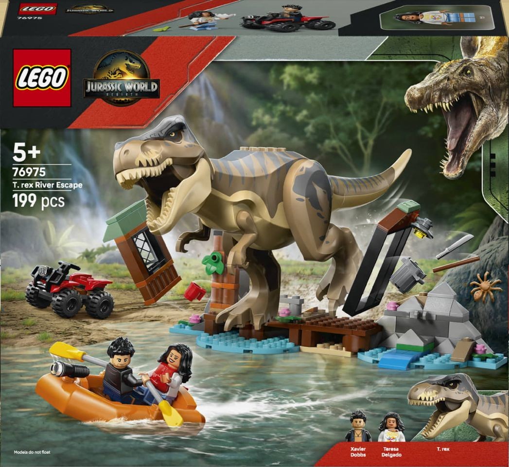 - LEGO Jurassic World Rebirth T. rex River Escape (76975) consente ai costruttori dai 5 anni in su di riprodurre un'emozionante scena del film e presenta un dinosauro T. rex modellato e completamente articolato, oltre a due minifigure: Teresa Delgado e Xavier Dobbs.