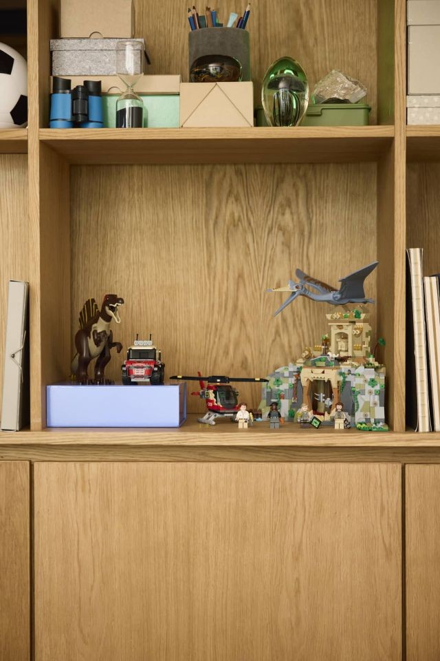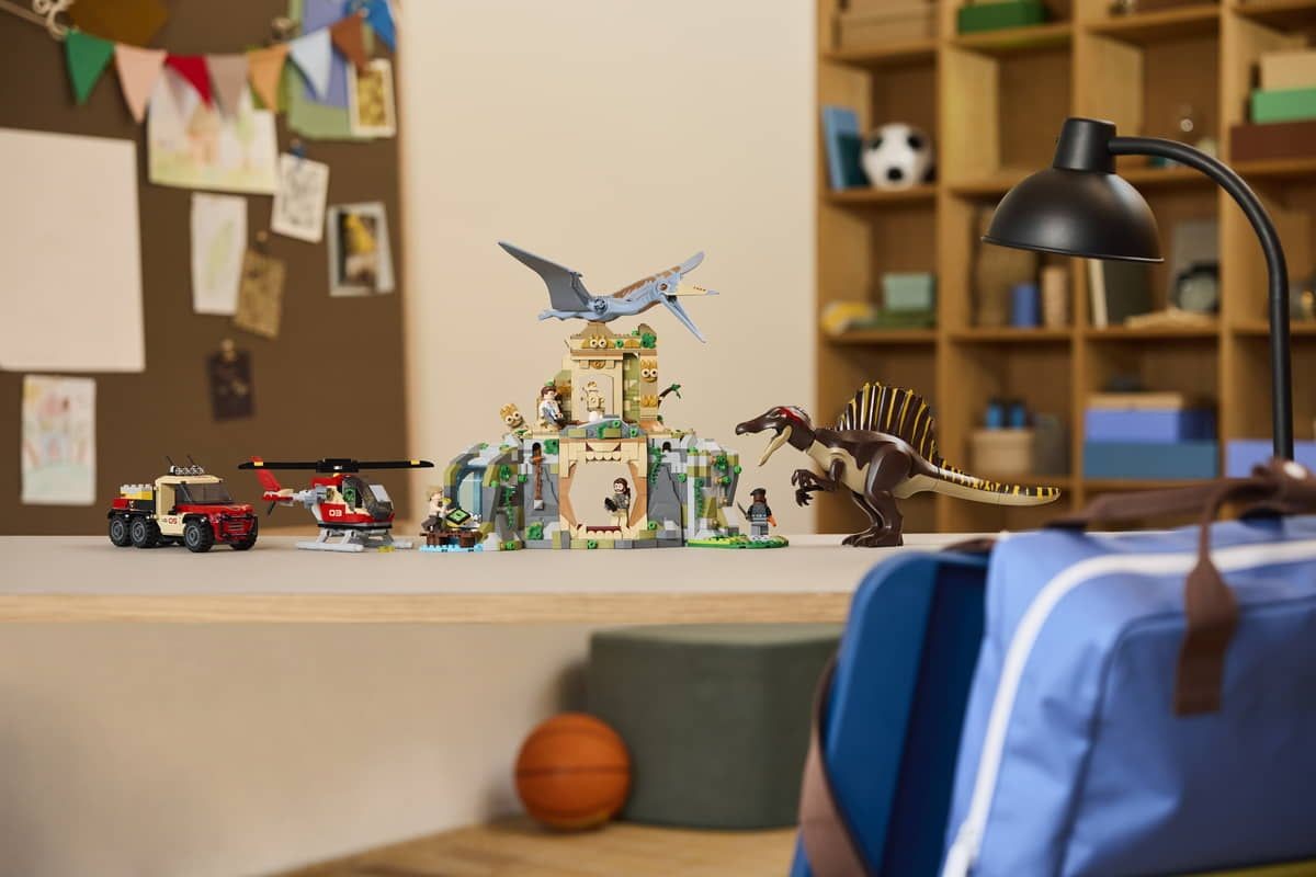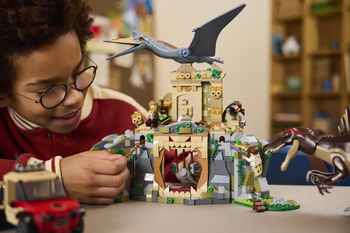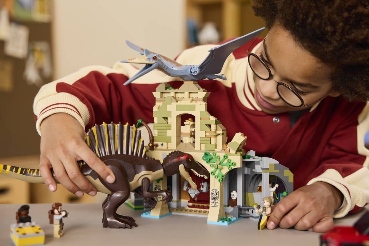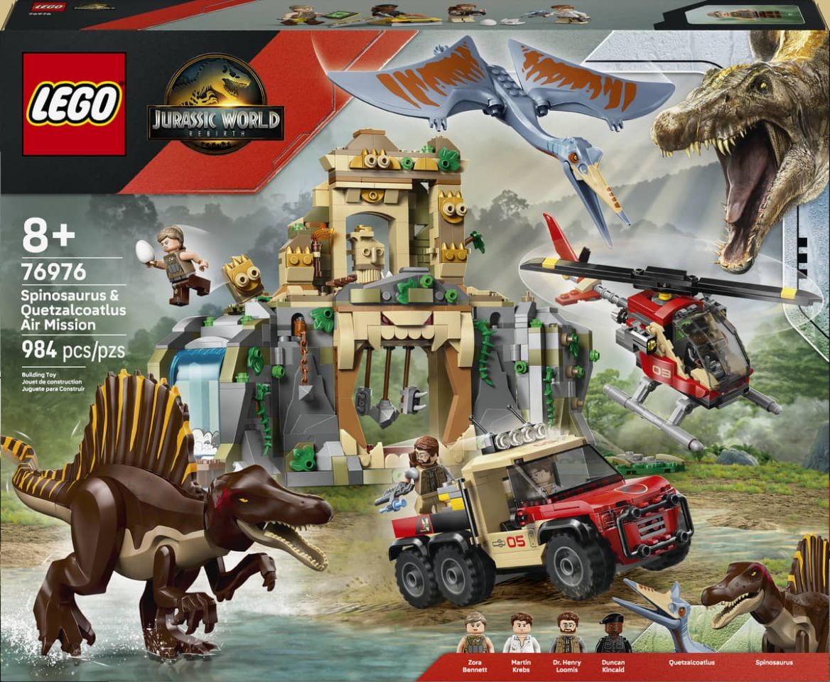 - LEGO Jurassic World Rebirth Spinosaurus & Quetzalcoatlus Air Mission (76976) per i fan dagli 8 anni in su presenta Zora Bennett, Martin Krebs, il Dr. Henry Loomis e Duncan Kincaid nell'antico tempio e i bambini possono giocare a raccogliere un prezioso campione di DNA dal nido del Quetzalcoatlus. Il set comprende anche uno Spinosauro con gambe, braccia, coda, testa e mascella mobili.
