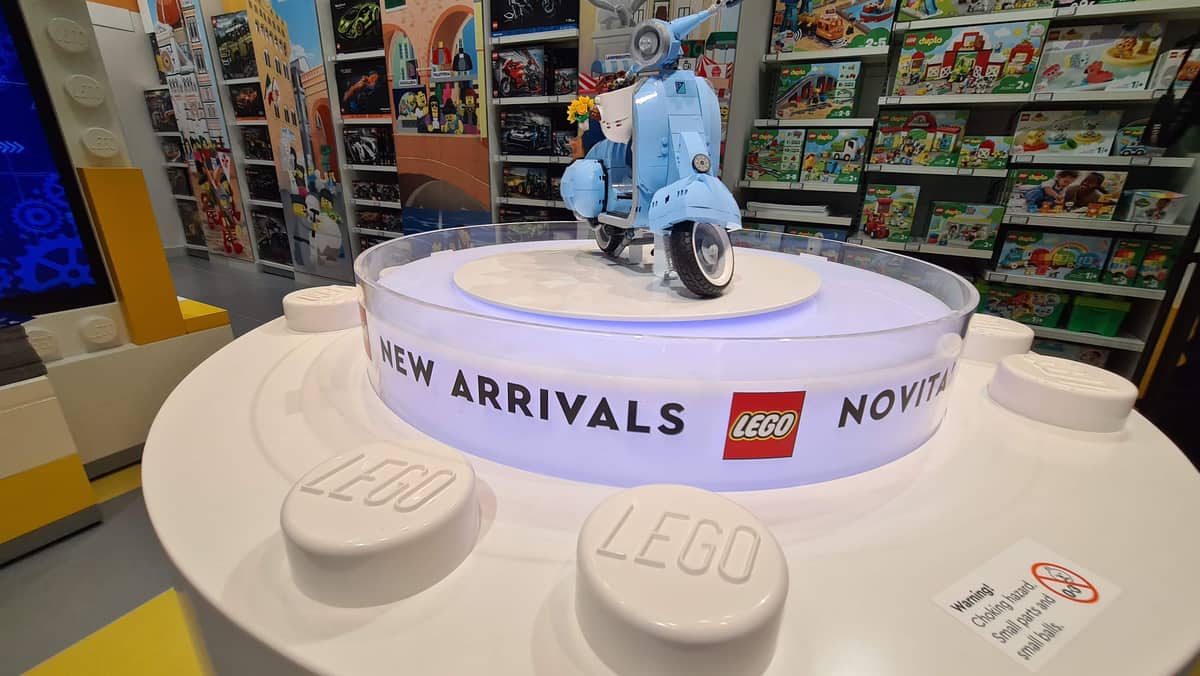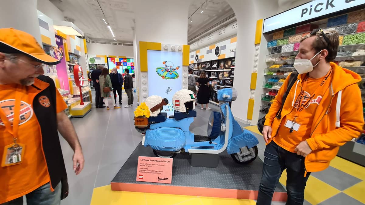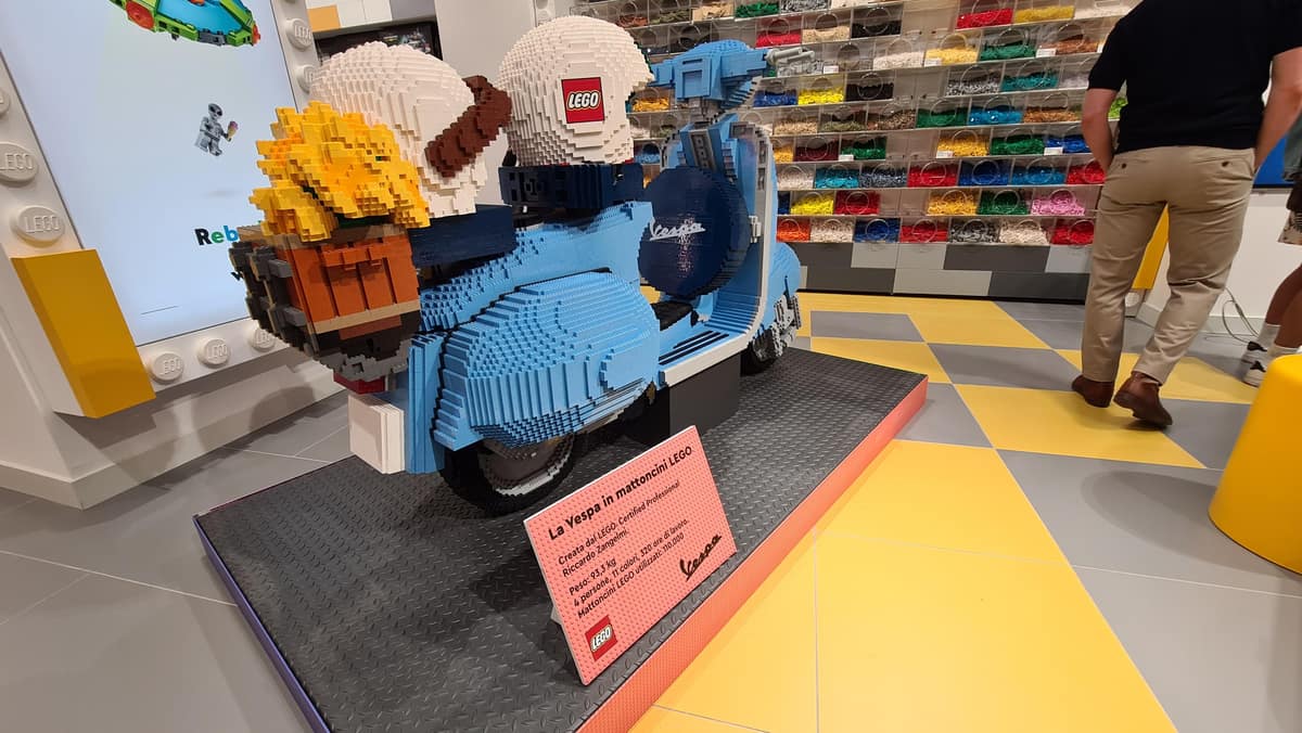Per rendere l’apertura ancora più indimenticabile, ad accogliere i visitatori un modello in scala 1:1 della Vespa 125, fatto completamente in mattoncini. Un capolavoro di ingegneria composto da 110.000 pezzi di 11 colori diversi, pesante 93.3 kg e realizzato in 320 ore di lavoro da un team di 4 esperti costruttori. Inoltre, solo il 14 e 15 maggio, insieme ad un acquisto di 120 €, sarà possibile portare a casa anche un esclusivo GWP LEGO® Store.