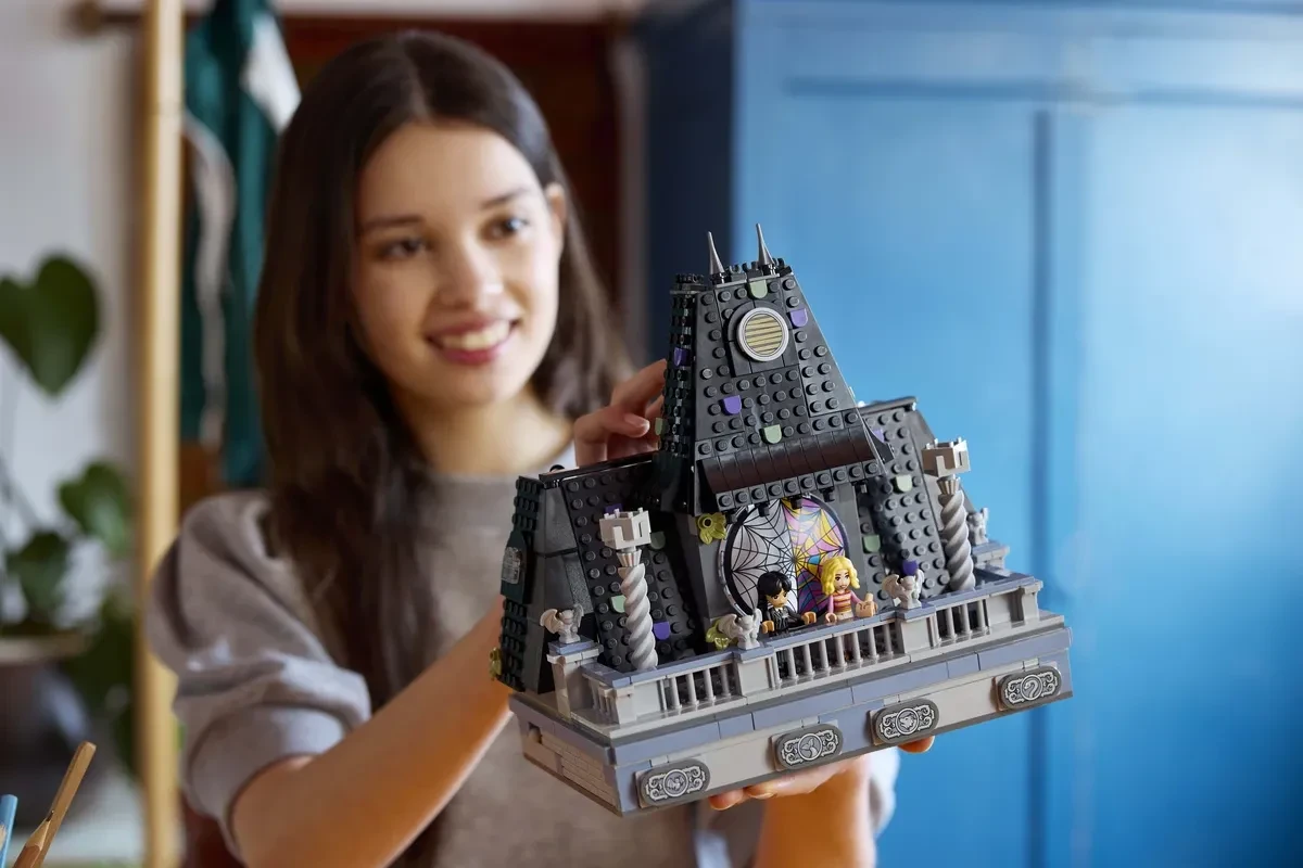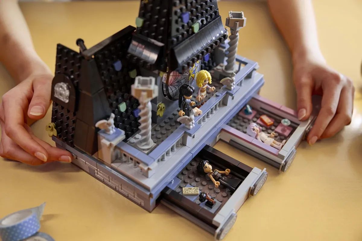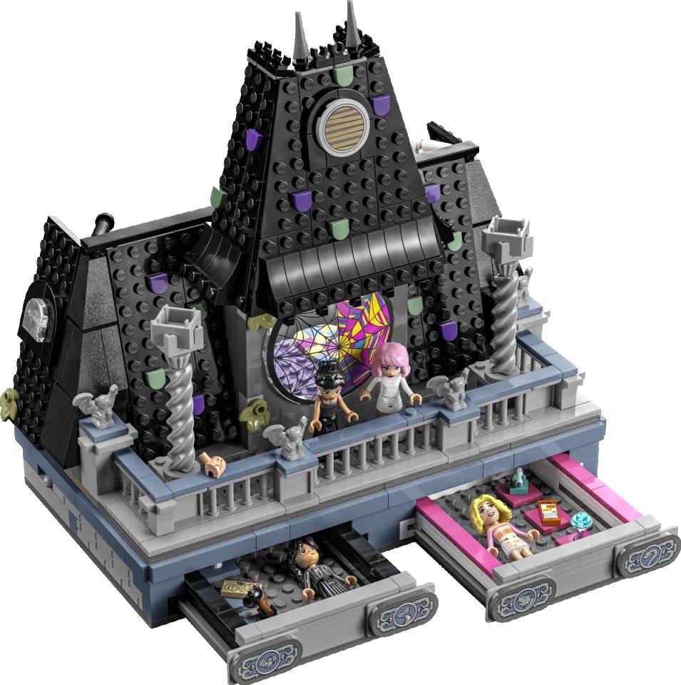 Le atmosfere bizzarre di Mercoledì si trasformano in un set che omaggia il dormitorio della piccola Addams e della sua compagna Enid. Genitori e figli possono decorare insieme la stanza e mettere in scena con le minifigure tante avventure da brivido ispirate alla serie cult.