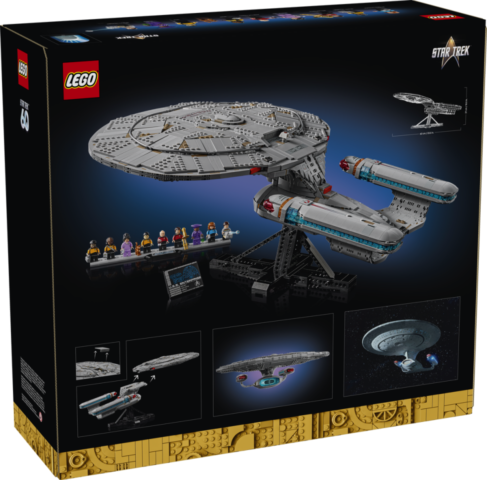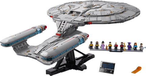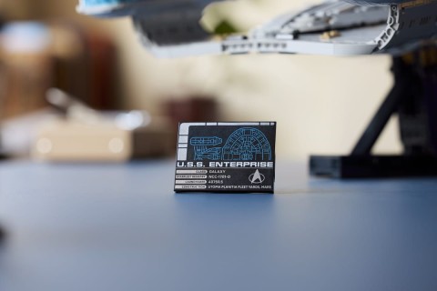 Progettato come un affascinante pezzo decorativo di fantascienza, il set è accompagnato da un supporto espositivo inclinato con una targa informativa per il modello della U.S.S. Enterprise, oltre a una piastrella espositiva per minifigure con il marchio Star Trek: The Next Generation.