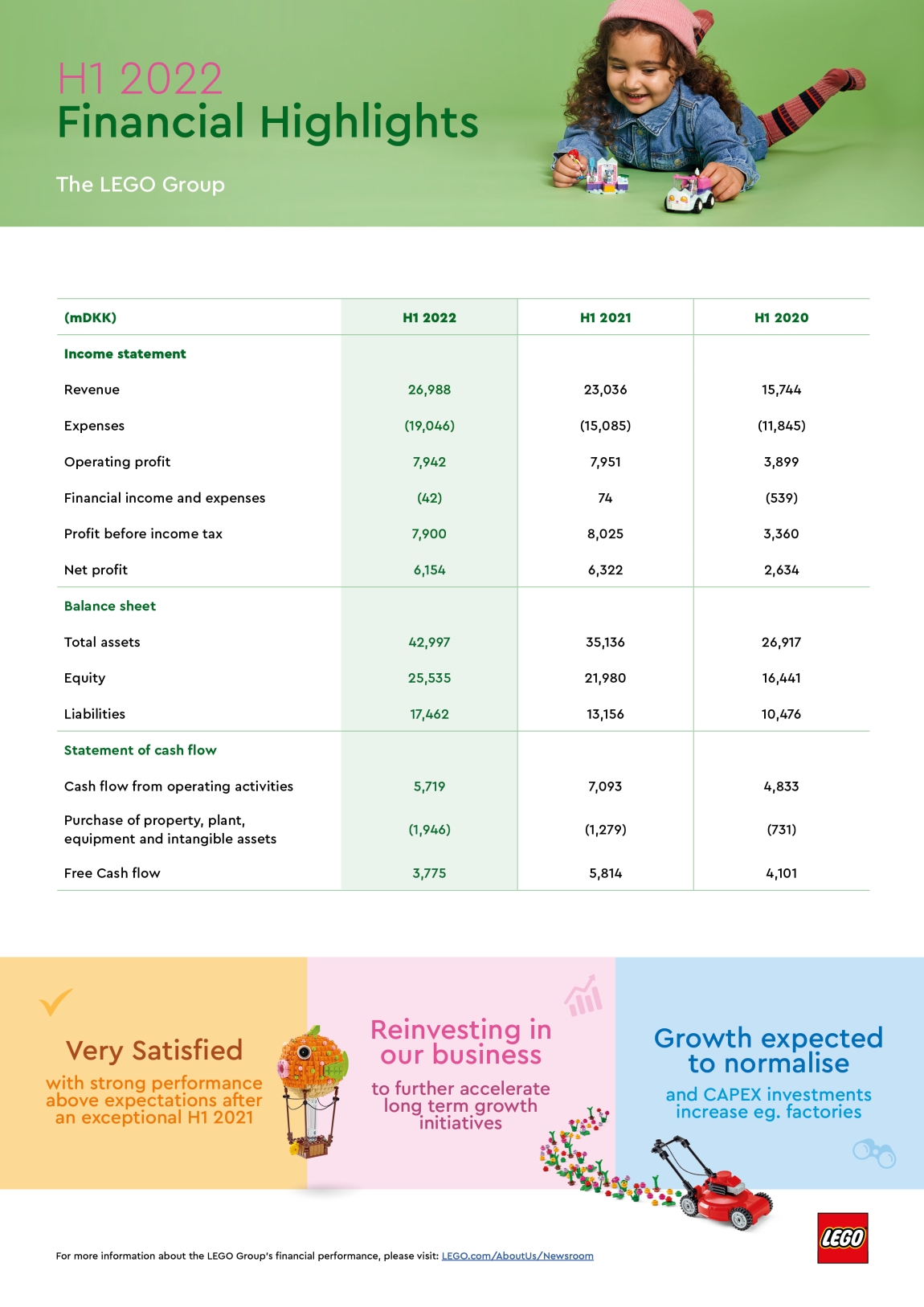 Christiansen ha commentato: "Per la seconda metà del 2022, continuiamo a rilevare una forte domanda per i nostri prodotti. A lungo termine ci aspettiamo che la crescita del fatturato si normalizzi a livelli più sostenibili. Continueremo inoltre a reinvestire nella nostra attività e ad accelerare iniziative come l'innovazione di prodotto, la digitalizzazione, la capacità produttiva, la rete di vendita al dettaglio e la sostenibilità, per mantenere lo slancio e garantire una crescita sostenibile nel lungo periodo. Questi significativi investimenti ci posizioneranno bene in futuro per portare l'apprendimento attraverso il gioco a un maggior numero di bambini e bambine in tutto il mondo”.