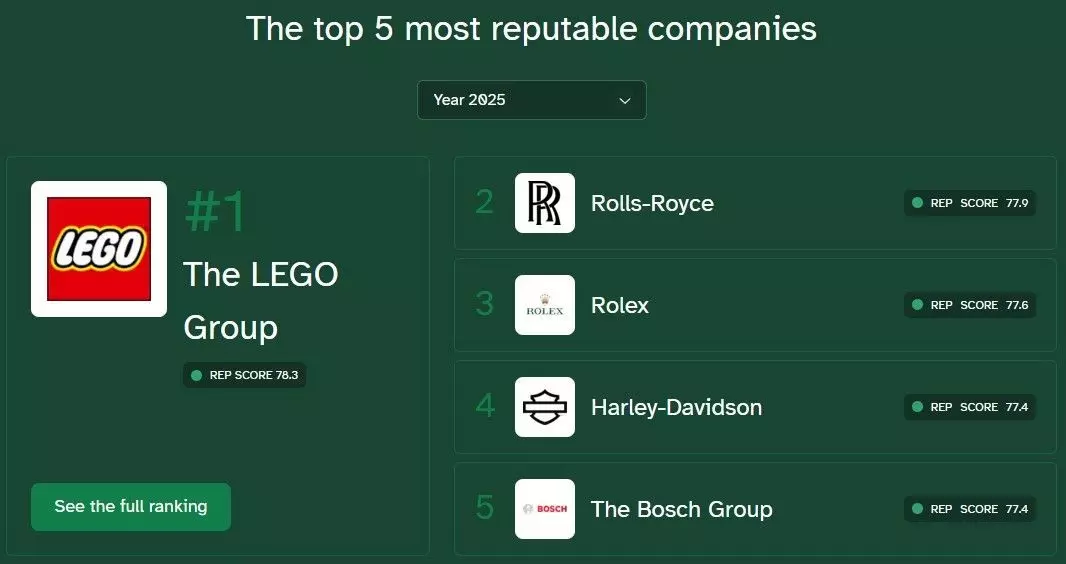 È il terzo anno consecutivo e la quinta volta negli ultimi sei anni che il LEGO Group conquista il primo posto, dopo i primi posti ottenuti nel 2020, 2021, 2023, 2024 e ora nel 2025.