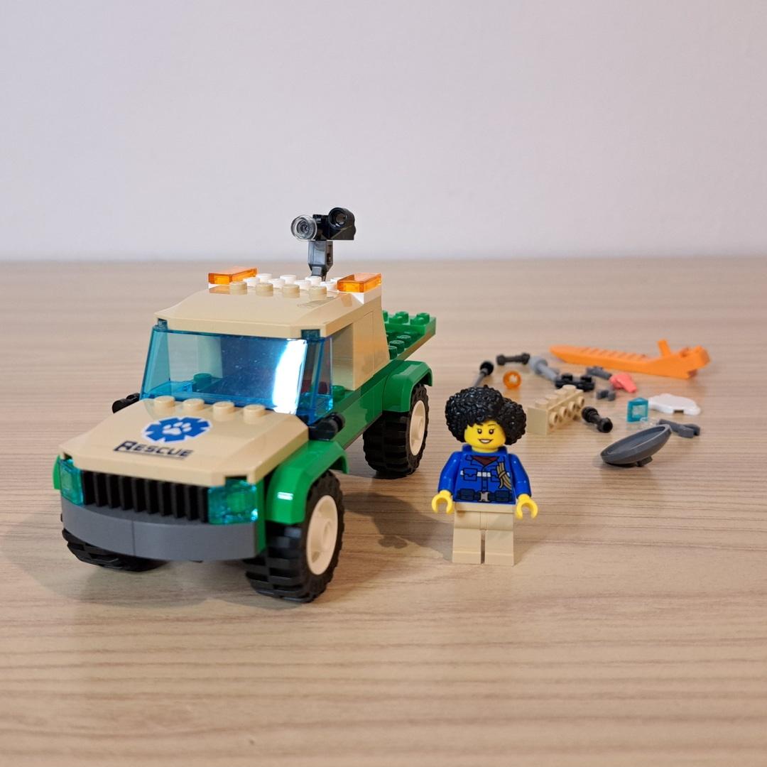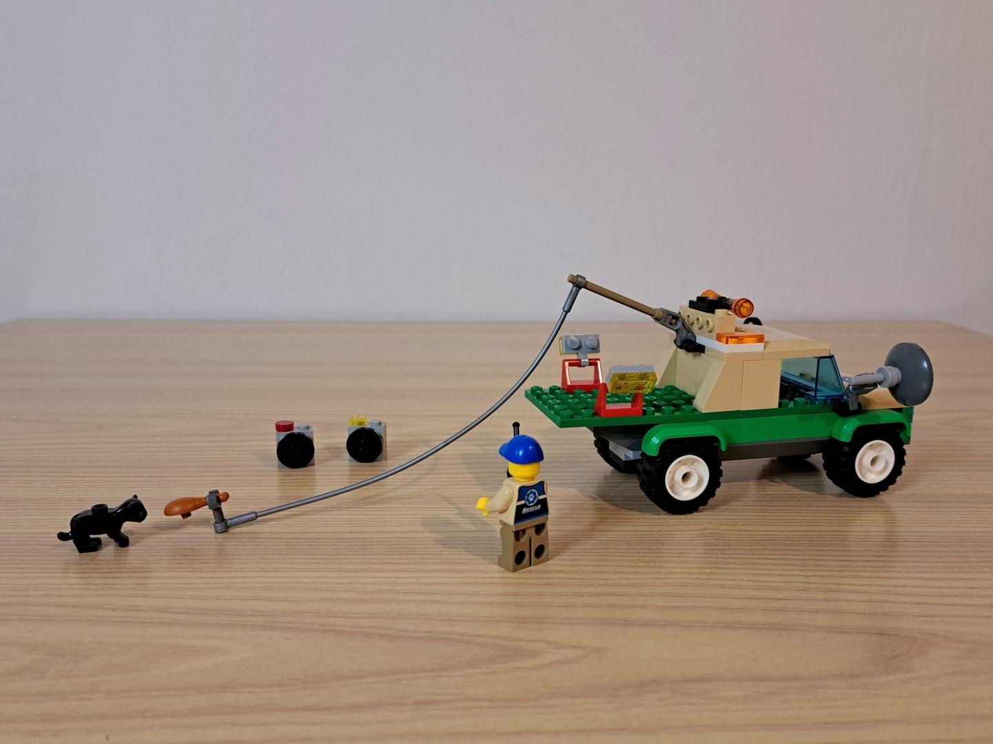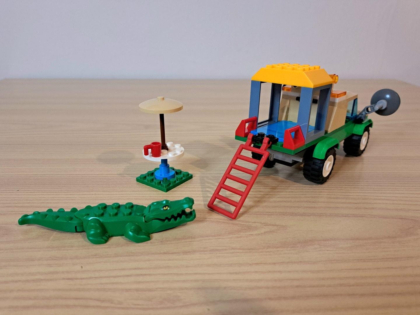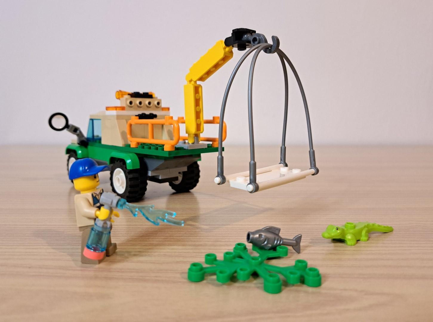 Sempre attingendo dalla busta 4, preparo un pesciolino e lo metto su delle foglie, in modo da attiralo. Nel fuoristrada costruisco un braccio con un gancio all’estremità che sostiene attraverso delle funi metalliche una barella. Il piccolo di coccodrillo, una volta sopra di essa, lo posso sollevare e trasportare e con un flacone spray posso spruzzargli acqua in modo da metterlo a proprio agio.