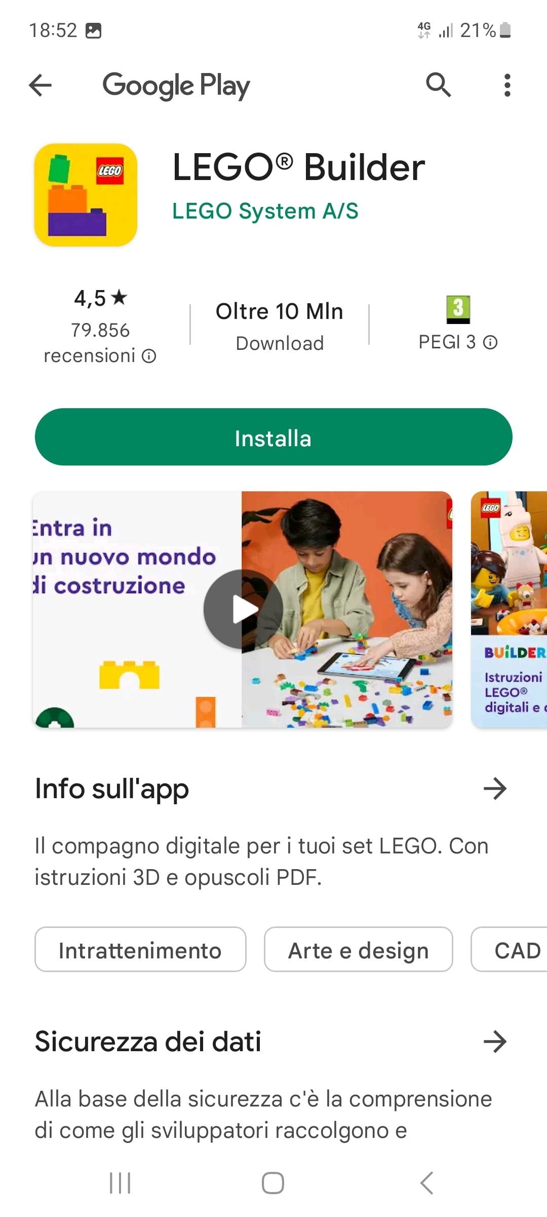 Prendo il mio smartphone, apro la fotocamera e inquadro il codice QR. Mi appare un indirizzo e facendo tap su di esso mi porta allo store, nel mio caso Play Store in quanto uso Android, e direttamente nella pagina dedicata all’app “LEGO® BUILDER”.