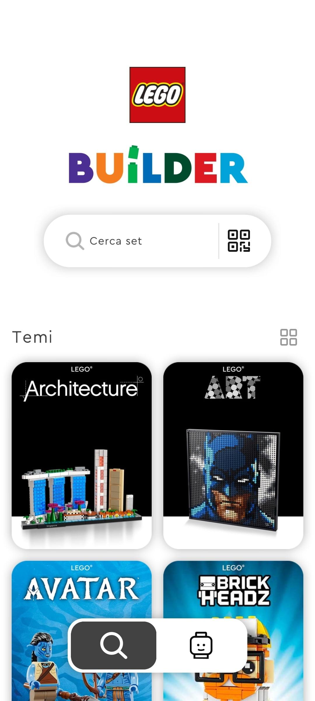 Dopo averla installata, apro l’app e inizio a esplorare. Scopro che oltre a essere gratuita posso usarla anche senza accedere all’account LEGO®. Nella schermata di apertura, sotto il logo, c’è un campo di ricerca, dove posso cercare anche un set che possiedo inquadrando il suo codice QR. Sotto di esso posso consultare i set usciti divisi per tema, compresi quelli ormai fuori catalogo, e all’interno divisi anche per anno di uscita. Di ogni set poi c’è una scheda.