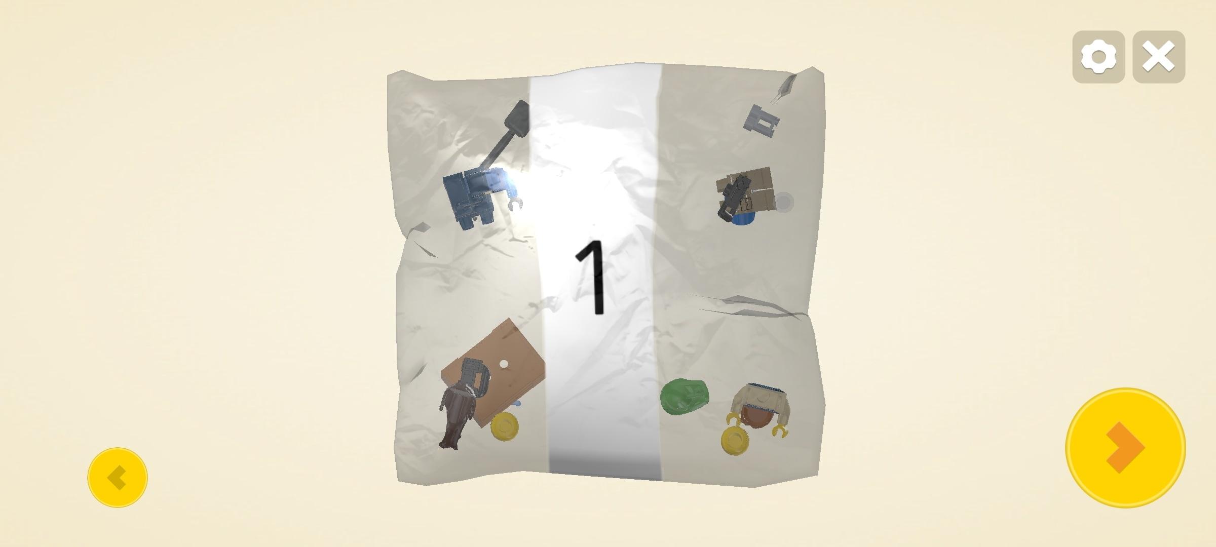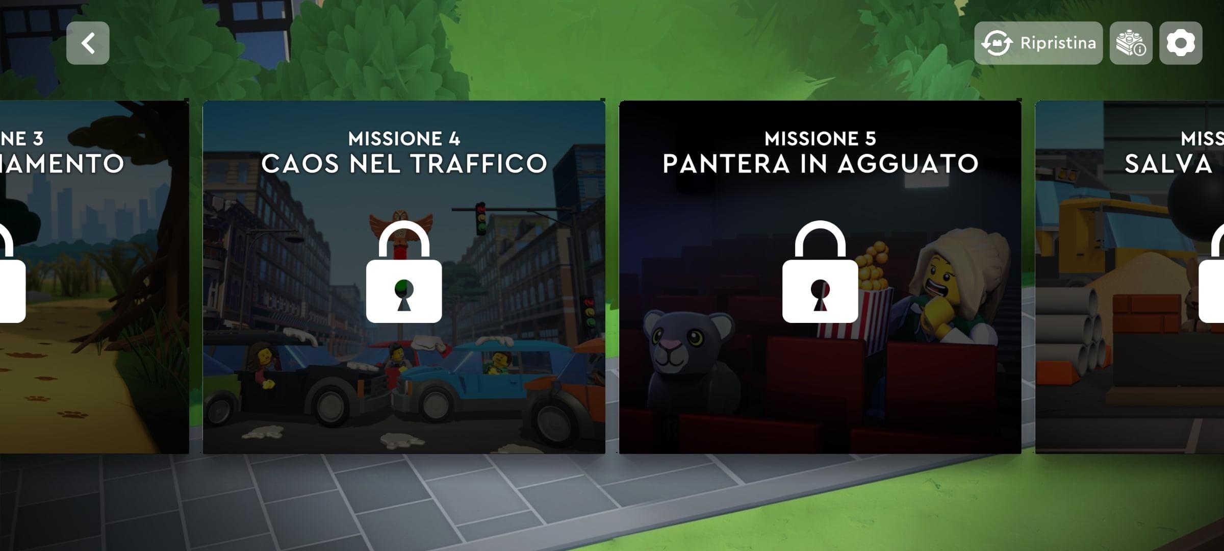 Una volta aperto mi trovo nell’ambiente di gioco. In primo piano ho le 8 missioni da aprire in sequenza (ognuna con un titolo) e in alto ci sono delle icone che servono per alcune impostazioni, quali volume dell’audio, della musica di sottofondo, ecc… E anche per vedere l’elenco dei pezzi del set.