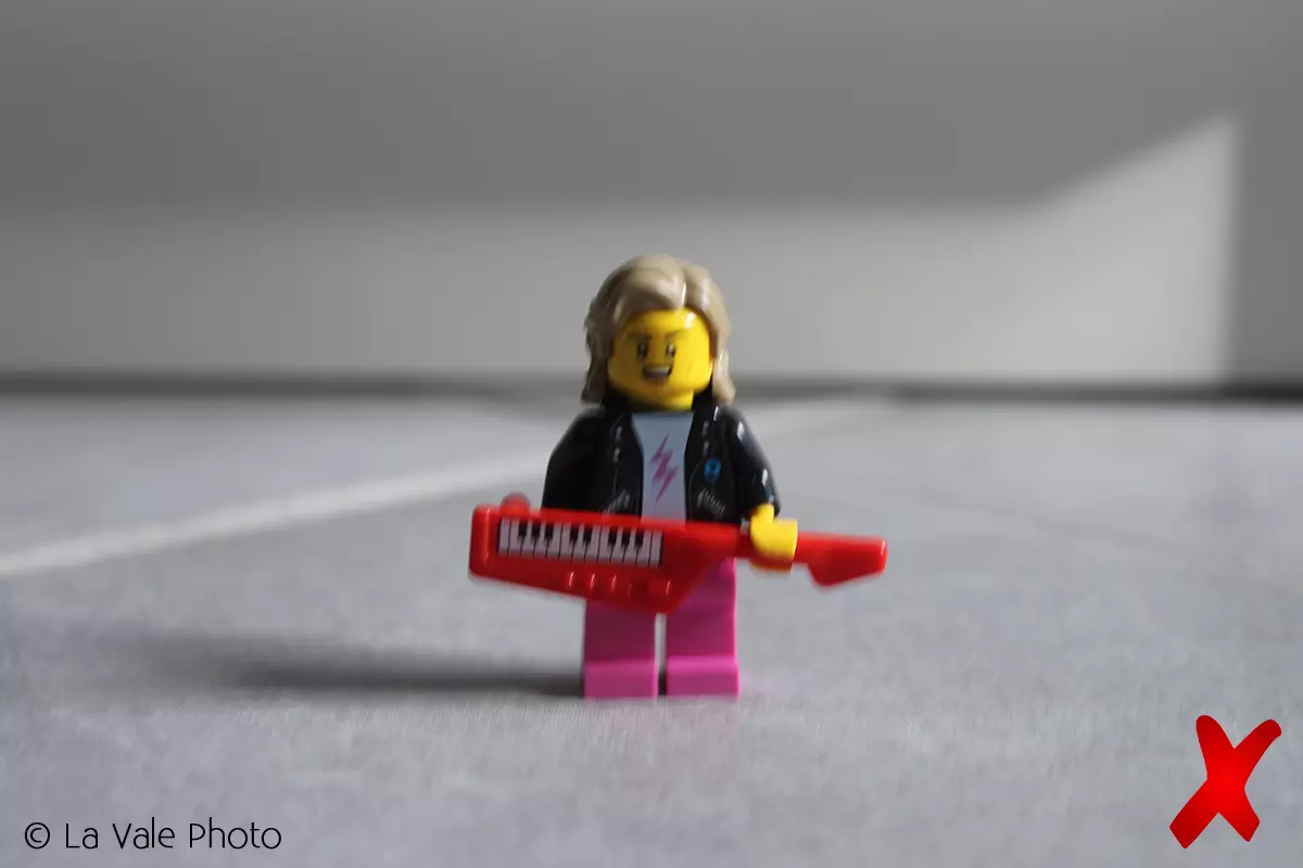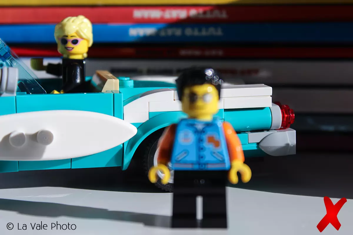 Analizziamo insieme le due foto seguenti. Nella prima foto, la Minifig è in primo piano e dovrebbe essere il soggetto principale dello scatto, ma il fuoco è sull'auto dietro, quindi la foto è sbagliata! La Minifig non è a fuoco perché non è nitida.