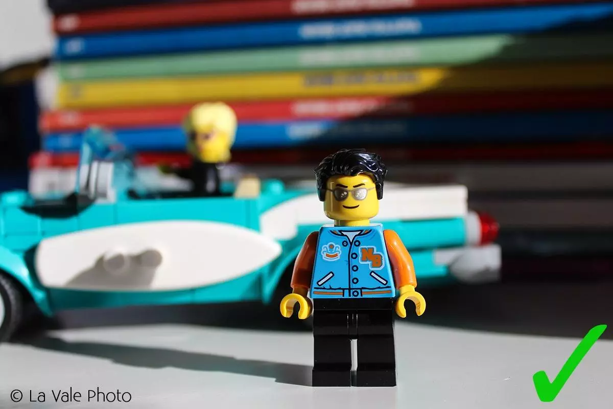 Nella seconda foto, la Minifig è correttamente a fuoco e l'auto dietro fa da sfondo: la Minifig è nitida e lo sfondo no, lo scatto è quindi corretto!