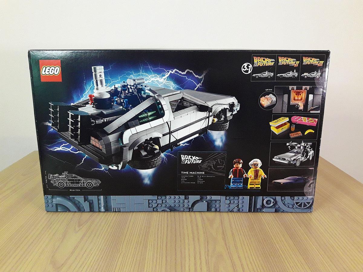 Guardando la confezione si capisce subito che è un set destinato agli adulti, oltre all’età consigliata (18+) notiamo lo stile e il colore nero. Davanti vediamo la DeLorean in versione primo film, mentre sul retro quella volante del secondo film ripresa da altra angolazione. Sul retro vengono anche anticipati gli accessori e il mattoncino luminoso. Inoltre viene mostrata la possibilità di fare tre versioni della DeLorean come si vede nei rispettivi film della trilogia (stessa cosa avvenne per il set del 2013).