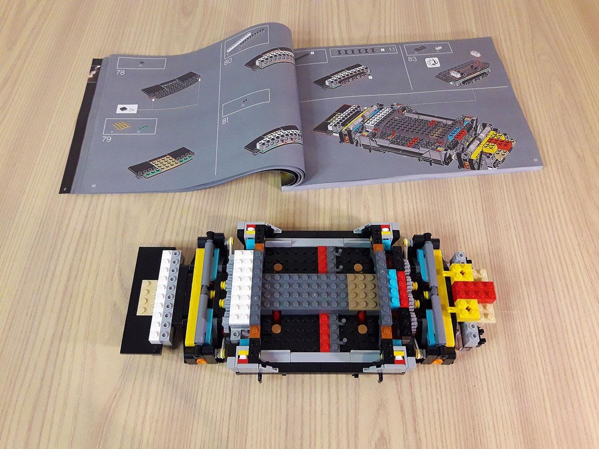 Una volta assemblate le minifigure, inizia la costruzione vera e propria della macchina del tempo, partendo dal telaio. La prima parte della costruzione è molto più tecnica e sofisticata, riguarda infatti la base della vettura, compresi gli ingranaggi necessari per l’inclinazione delle ruote. A tale scopo vengono usati molti pezzi Technic. Man mano che la vettura viene su iniziano a formarsi il vano del cofano anteriore, quello dell’abitacolo e quello della parte posteriore.