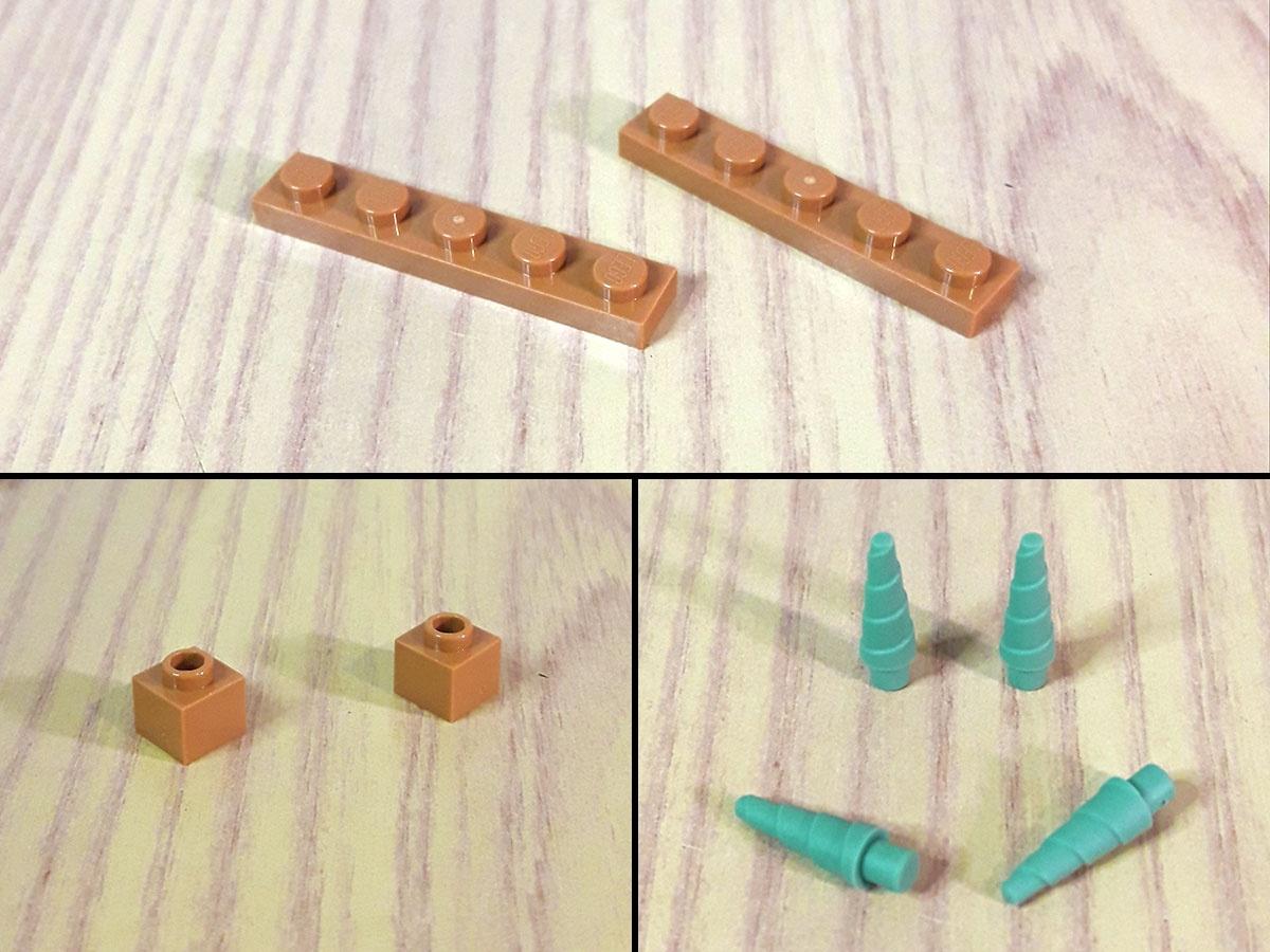 Non mancano pezzi inediti per la gioia di Afol e collezionisti, come il brick 1x1 alto due stud, il plate 1x5 e dei piccoli coni colore sand green.