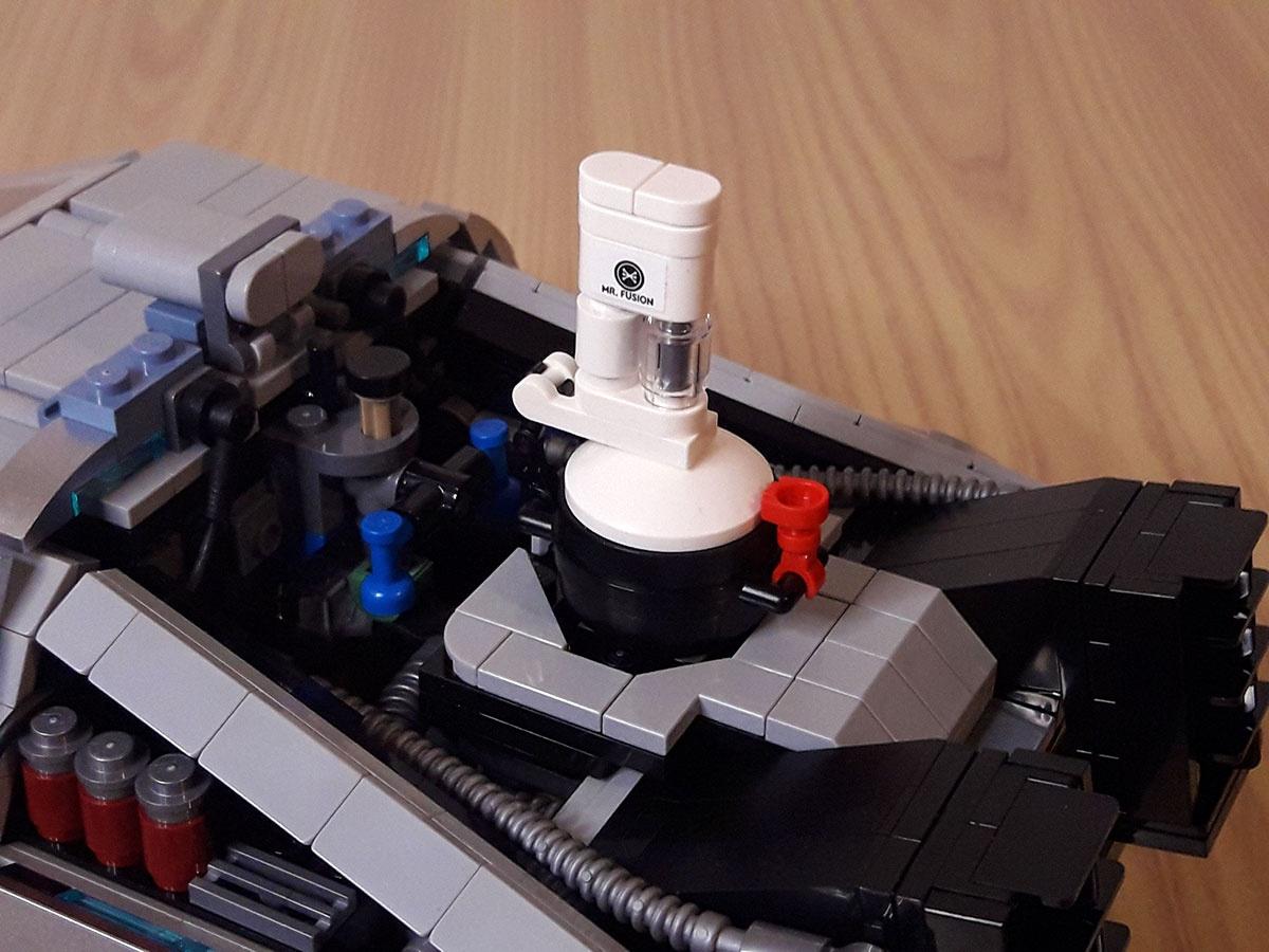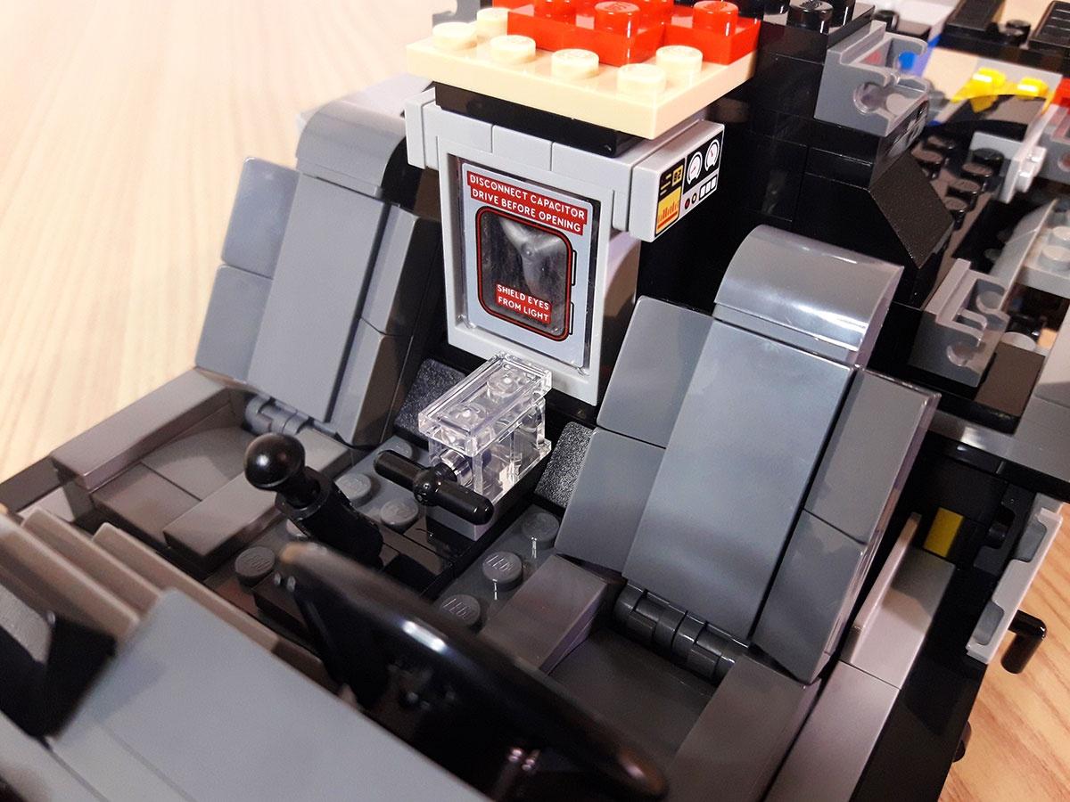 Nell’abitacolo troviamo il cruscotto, i tempo circuiti e i potenziometri, tutti con gli adesivi. Anche per il flusso canalizzatore c’è un adesivo ma solo per la cabina, dentro abbiamo la Y fatta con un arpione e dietro di essa il mattoncino luminoso, che possiamo accendere grazie a un meccanismo con un bottone posto nella parte superiore subito dopo il tetto; molto pratico e ingegnoso devo dire. Le portiere ad ali di gabbiano sono ben fatte e solide, ma non hanno il vetro e non restano aperte da sole. Il retro infine è molto fedele, con il reattore nucleare, i vari tubi, le bande di flusso esterne, fatte coi tile metallizzati, e le grosse ventole di raffreddamento posteriori.
