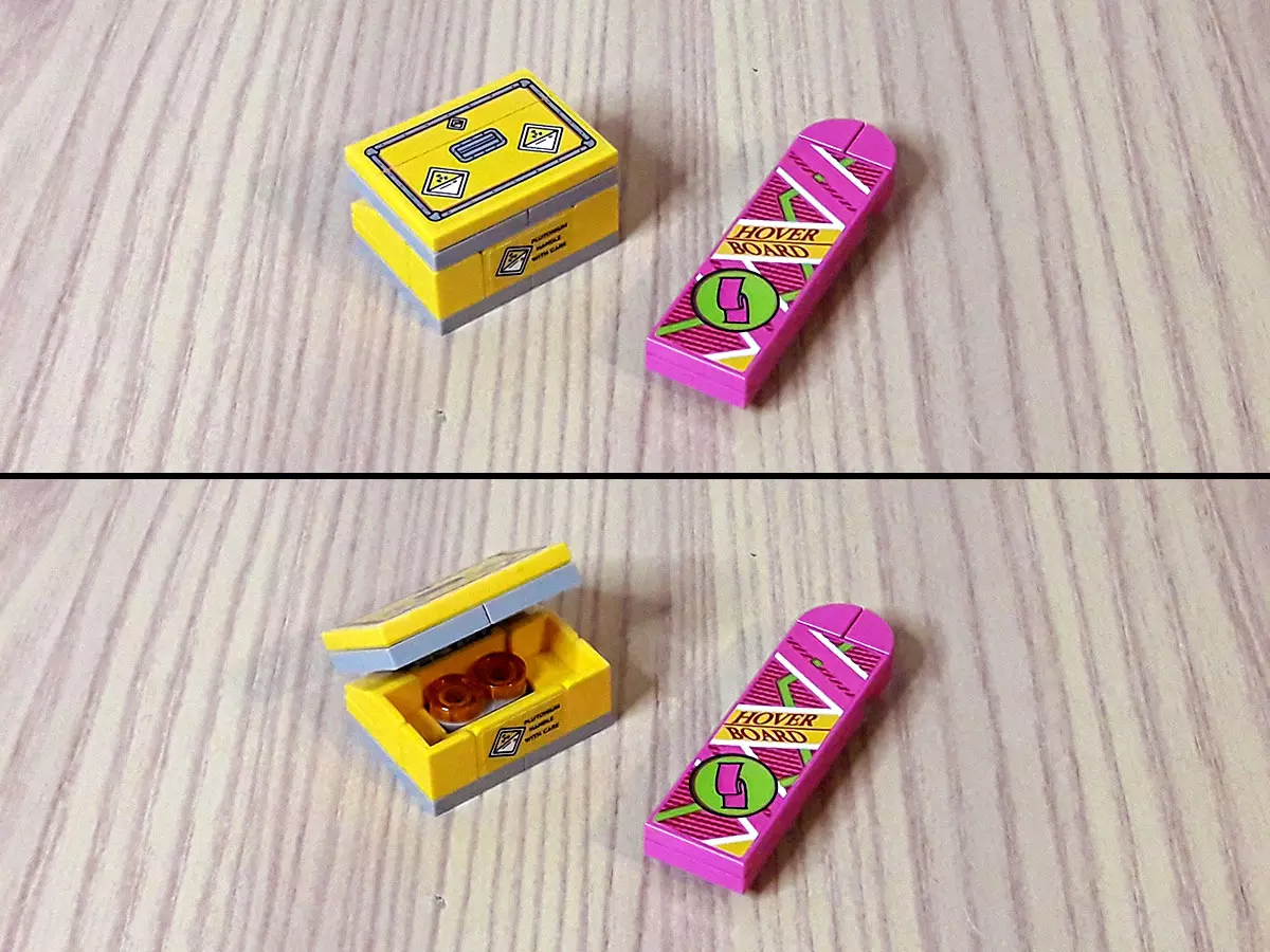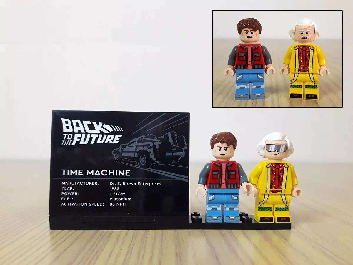 Come minifigure abbiamo Marty McFly e Doc Brown, entrambi in versione 2015 e ognuno con la duplice espressione facciale, una col sorriso e una preoccupata/tesa. Non essendo la DeLorean in scala minifigure, entrambi sono da collocare di fianco all’apposito espositore, che riporta alcuni dati della macchina del tempo; abbastanza essenziale direi, ma carino. La scelta di inserire i personaggi in versione 2015 è stata utile per chi aveva già preso il set del 2013, in quanto allora Marty e Doc erano in versione 1985.